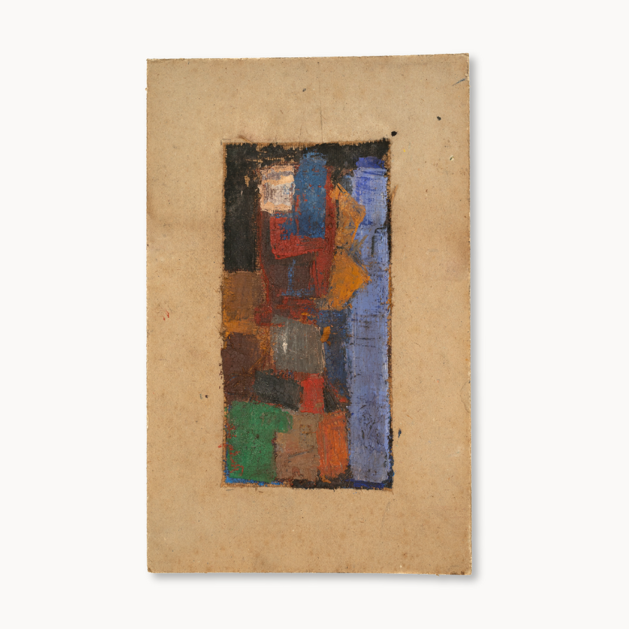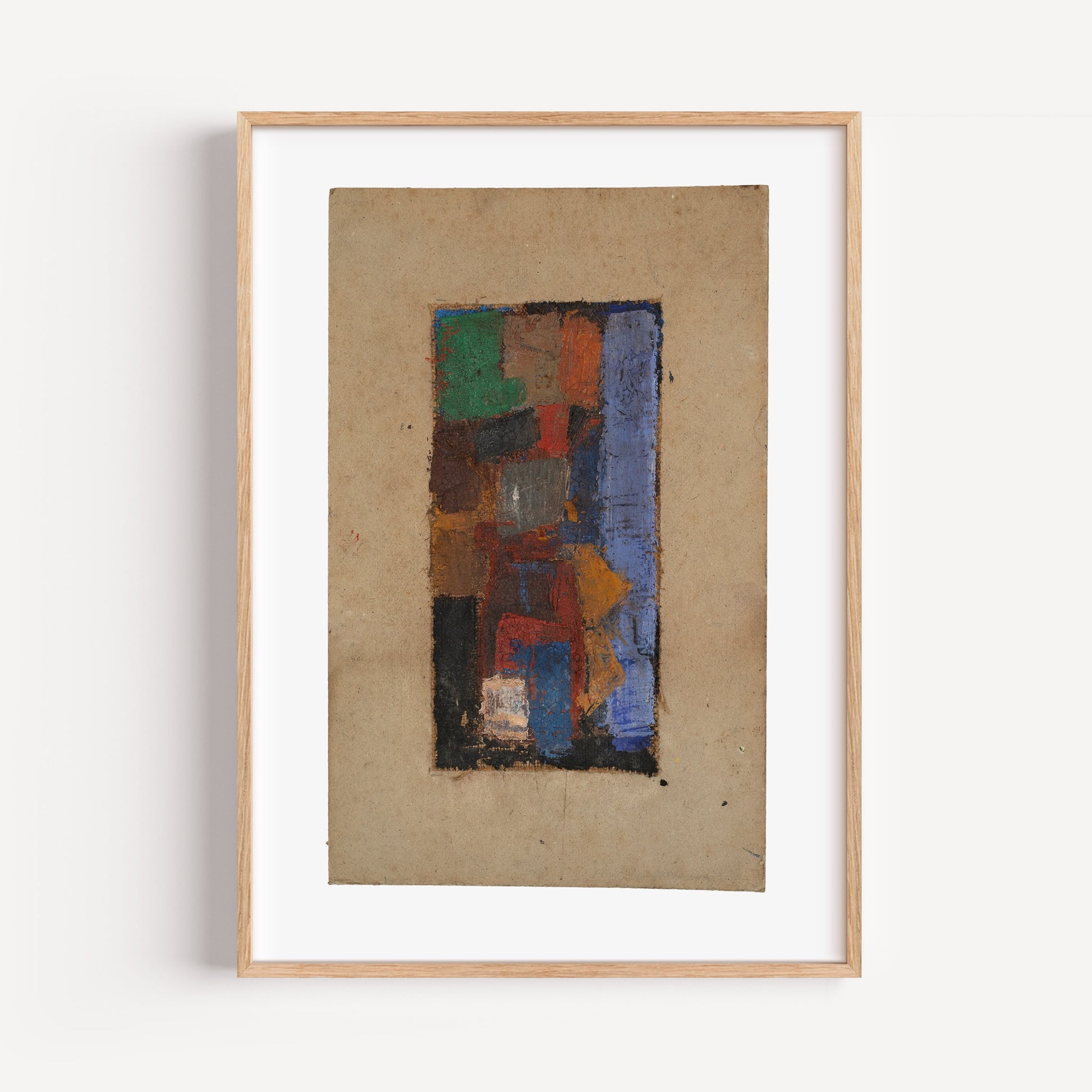 A striking exploration of color and form, this abstract composition features layered blocks of emerald, ochre, and indigo against a timeworn parchment backdrop. The textured brushwork and bold geometric interplay evoke a sense of depth and quiet movement, making it a compelling study in modernist abstraction. Its raw edges and aged surface further enhance its authenticity, offering collectors a sophisticated piece with a rich, storied character.