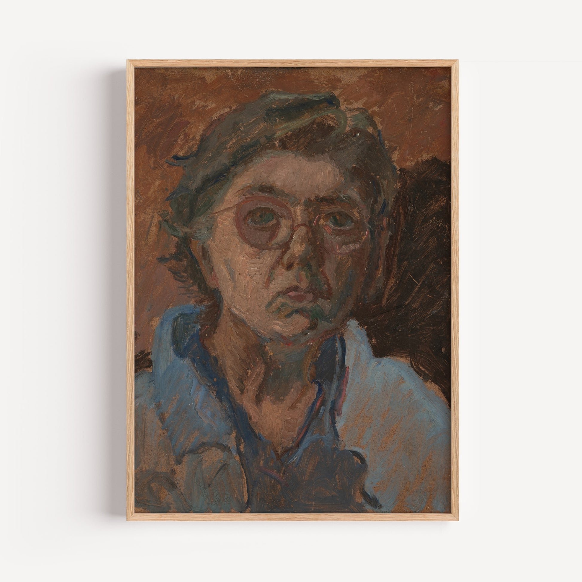An evocative study in character and mood, this vintage portrait captures a moment of quiet introspection. Rendered in earthy, painterly strokes, the subject’s gaze holds a raw honesty, complemented by a muted palette of warm terracottas and faded blues. The expressive brushwork and timeworn patina give the piece a soulful, old-world quality that speaks to its history and enduring artistry.