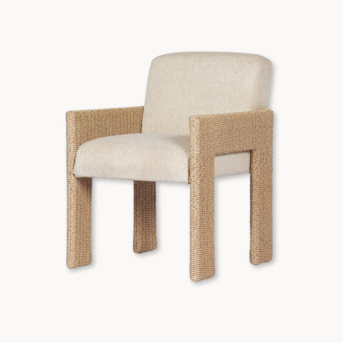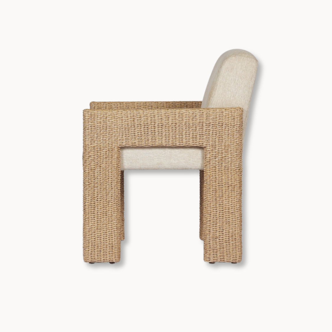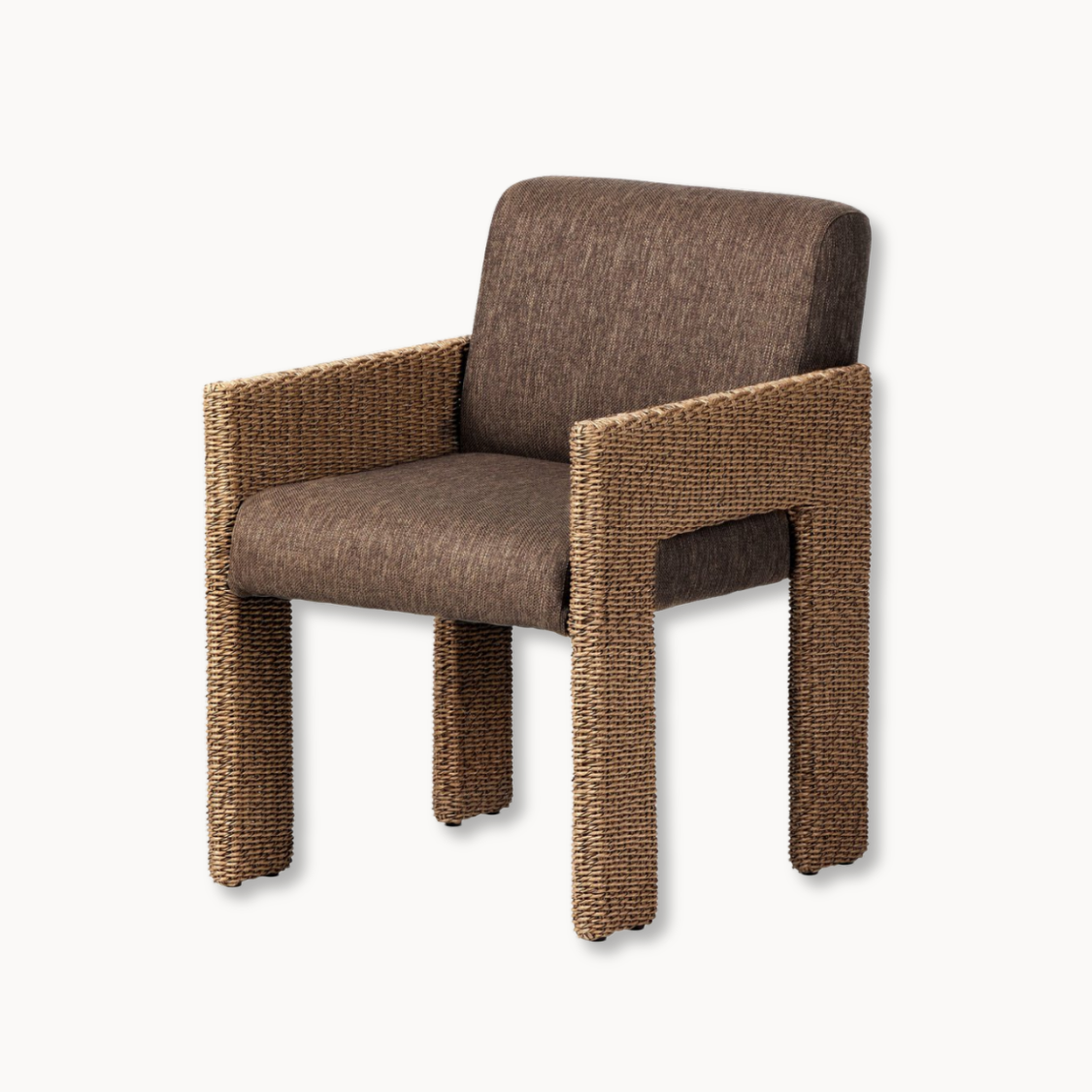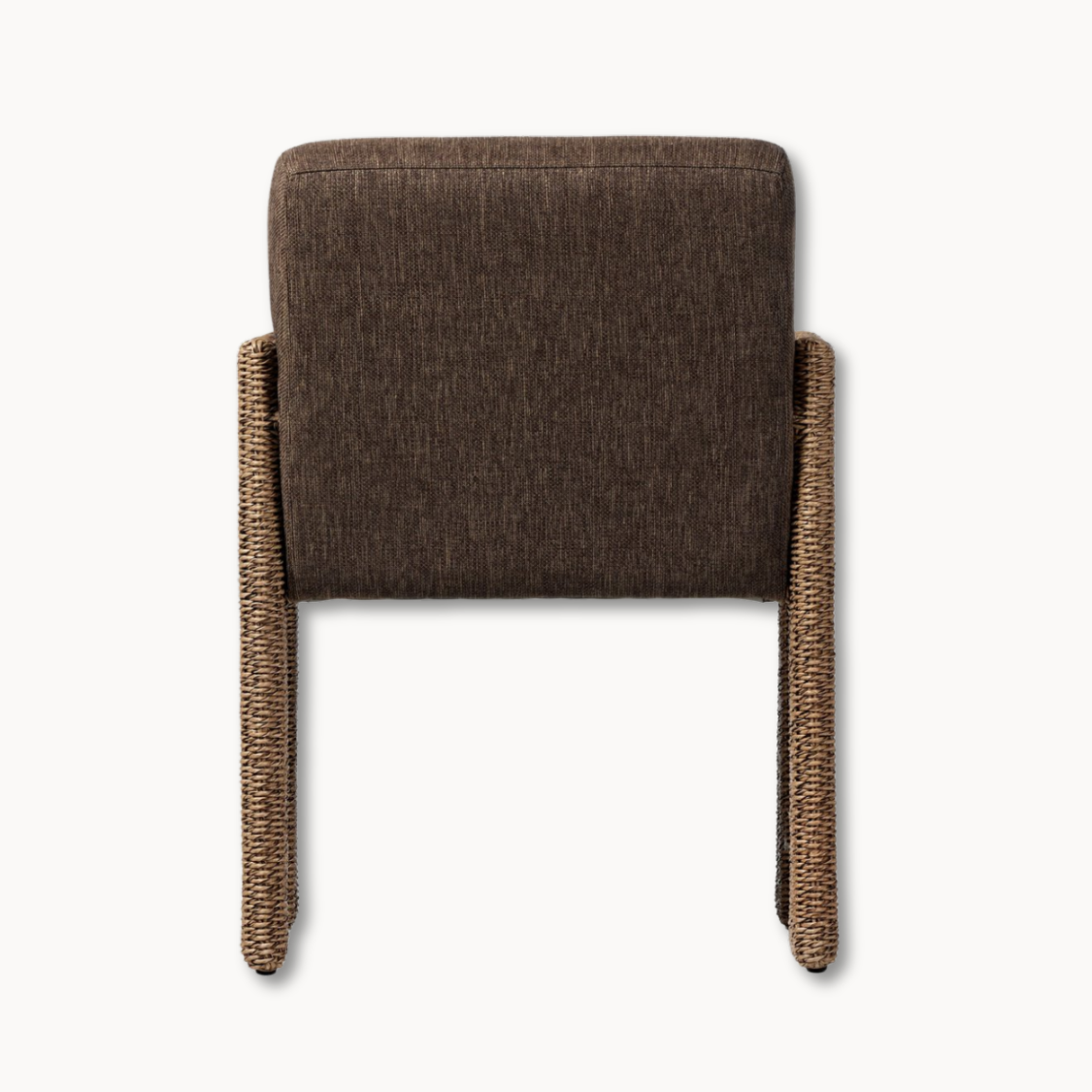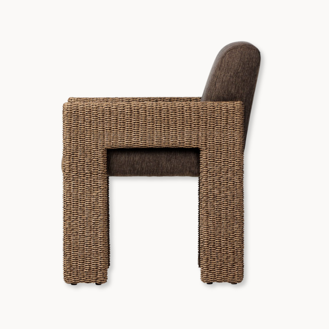 The Gibbs Outdoor Dining Chair redefines alfresco dining with its bold, structured design. Featuring a traditional silhouette with a modern twist, this chair pairs rich upholstery with intricately woven legs for a striking two-tone effect. The voluminous seating ensures maximum comfort, perfect for long, leisurely meals outdoors. Add a sophisticated touch to your patio or dining area with this statement-making piece.