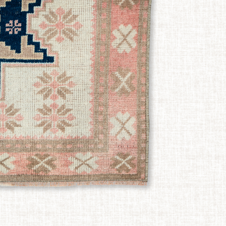This striking vintage Anatolian rug features a bold triple medallion design, each star-shaped motif rendered in deep midnight blue with soft blush and sand accents. The central octagonal insets display delicate floral patterns, while the surrounding field is filled with pastel botanical repeats for an airy, balanced look. Handwoven with traditional Turkish techniques, it blends geometric strength with subtle romance, making it a statement piece for both modern and classic interiors.