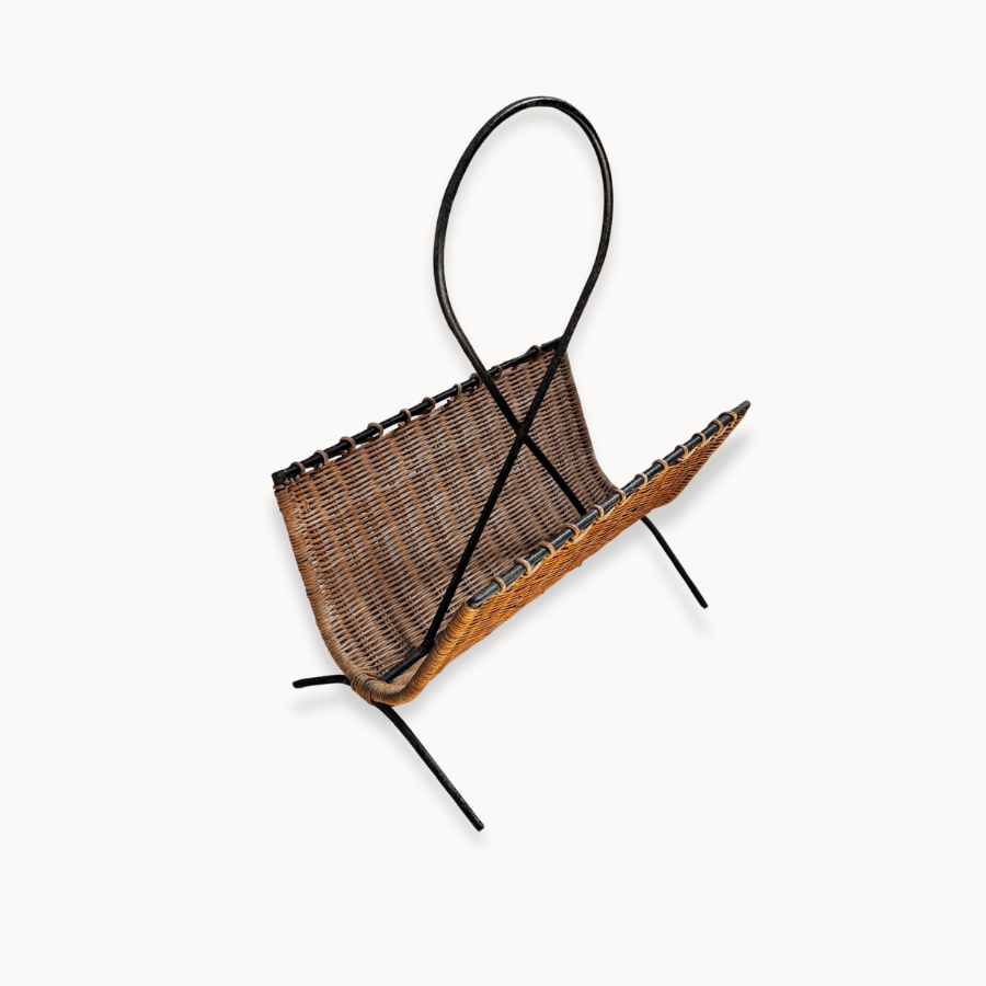 Vintage rattan magazine rack with natural woven construction and timeless appeal. Perfect for organizing publications...