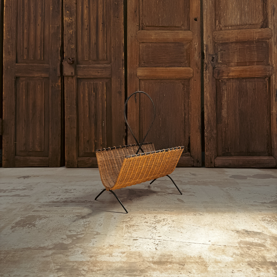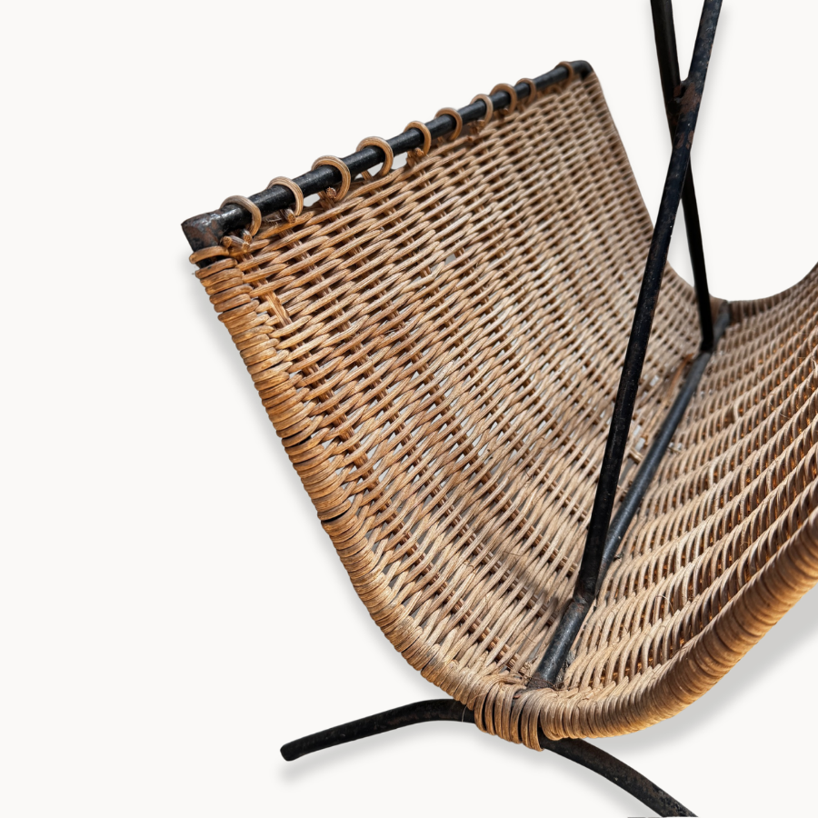 Vintage rattan magazine rack with natural woven construction and timeless appeal. Perfect for organizing publications, catalogs, or decorative storage in living rooms, studies, or entryways. The open-frame design showcases the craftsmanship of traditional rattan weaving while keeping reading materials within easy reach. A functional accent piece that complements both eclectic and curated interior spaces.
