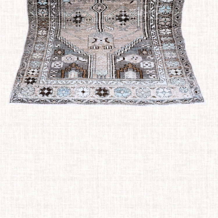 The Ashara Runner blends earthy sophistication with a touch of rustic charm. Its elongated form is anchored by a bold central medallion in rich mocha tones, softened by the muted taupe and pale stone backdrop. Delicate floral and geometric motifs dance along the borders, adding visual rhythm without overwhelming the piece. Hand-knotted with an artful balance of contrast and softness, this runner brings understated elegance to hallways, entryways, or layered interiors. A timeless piece that quietly commands attention.