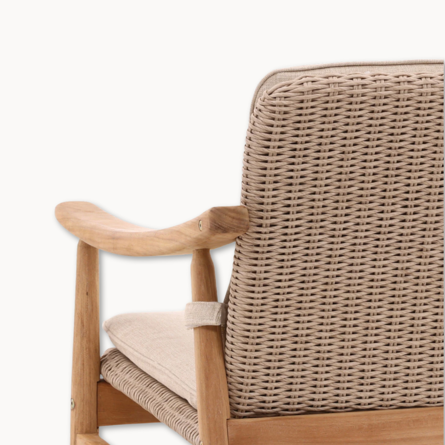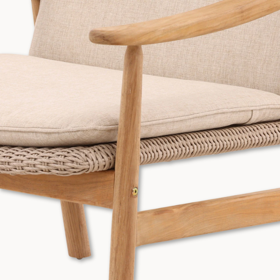 Elevate your outdoor space with the Ashford Outdoor Occasional Chair. Crafted with durable materials, including outdoor performance linen, twisted synthetic wicker, and teak wood, this chair is both stylish and sturdy. The beige and natural finish adds a touch of rustic charm, while the 100% Olefin fabric provides exceptional comfort and performance. Transform your patio or garden into a cozy retreat with this versatile and elegant chair.