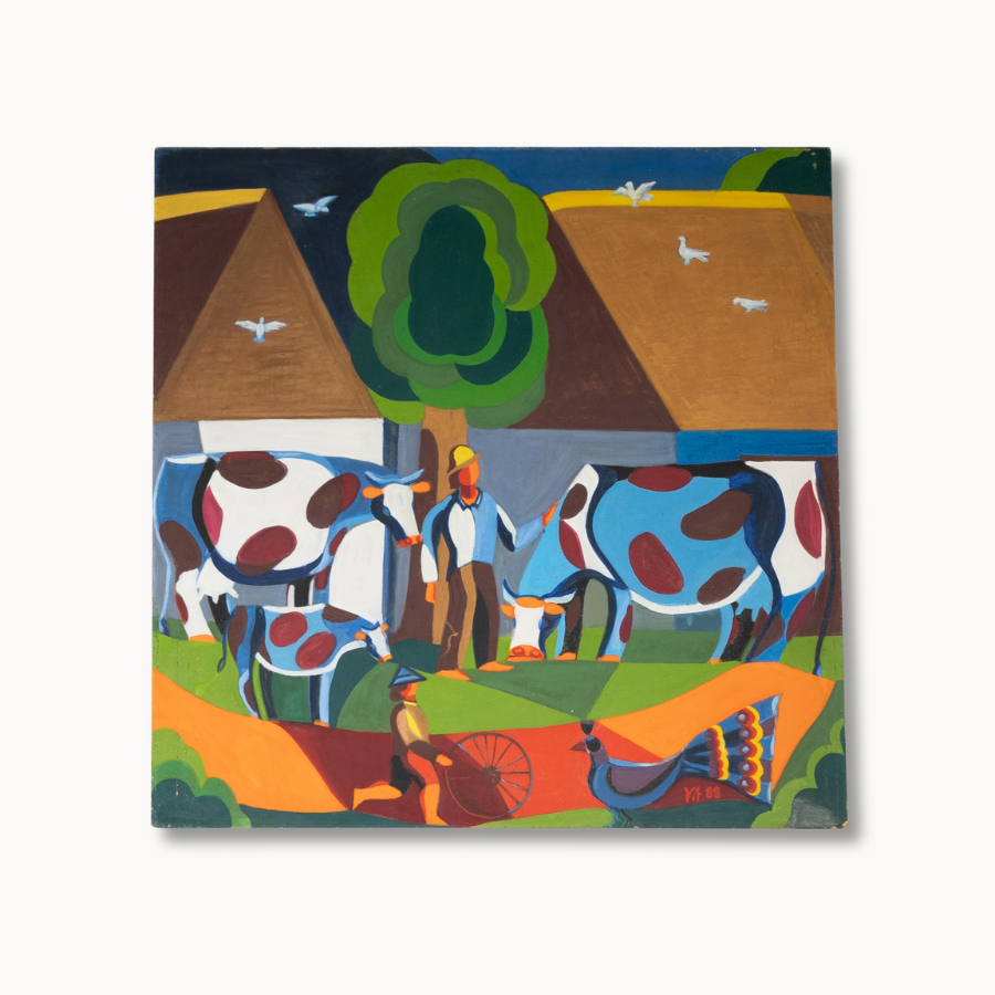 With pastoral charm and modern vibrancy, “Blue Bell” by Vitek reimagines country life through a kaleidoscope of bold shapes and saturated hues. The rhythmic arrangement of spotted cattle, lush green pastures, and stylized rooftops creates a lively yet harmonious scene. Vitek’s dynamic brushwork and playful geometry elevate a simple farm moment into a sophisticated contemporary composition. A striking conversation piece, perfect for bringing a touch of whimsical elegance to curated interiors.