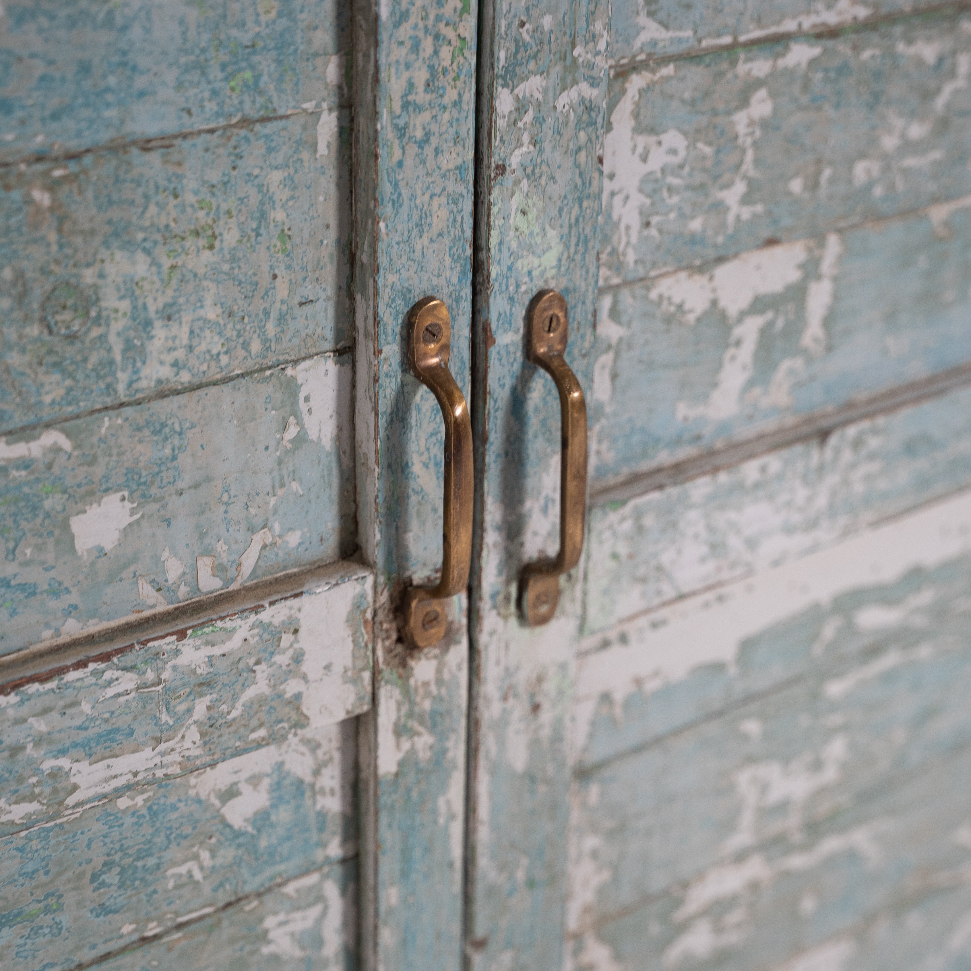 The Caribbean Dresser captures breezy coastal charm with its weathered seafoam colored finish and naturally distressed patina. Crafted from solid wood, its double-door design offers generous storage while exuding relaxed, timeworn beauty. Subtle brass hardware adds a hint of understated elegance. Perfect for beach-inspired interiors or eclectic spaces craving a touch of sun-faded, island character.