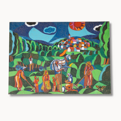 Infused with vitality and a sweeping sense of scale, “Green for Miles” by Vitek transports viewers into an endless, sunlit landscape. Rolling emerald hills, dotted with vibrant figures and clustered rooftops, stretch toward a glowing horizon under a brilliant sky. The layered geometry and rich chromatic contrasts create a scene both playful and sophisticated, celebrating nature’s boundless expanse. A vivid, conversation-starting work for those who appreciate art that feels alive and expansive.