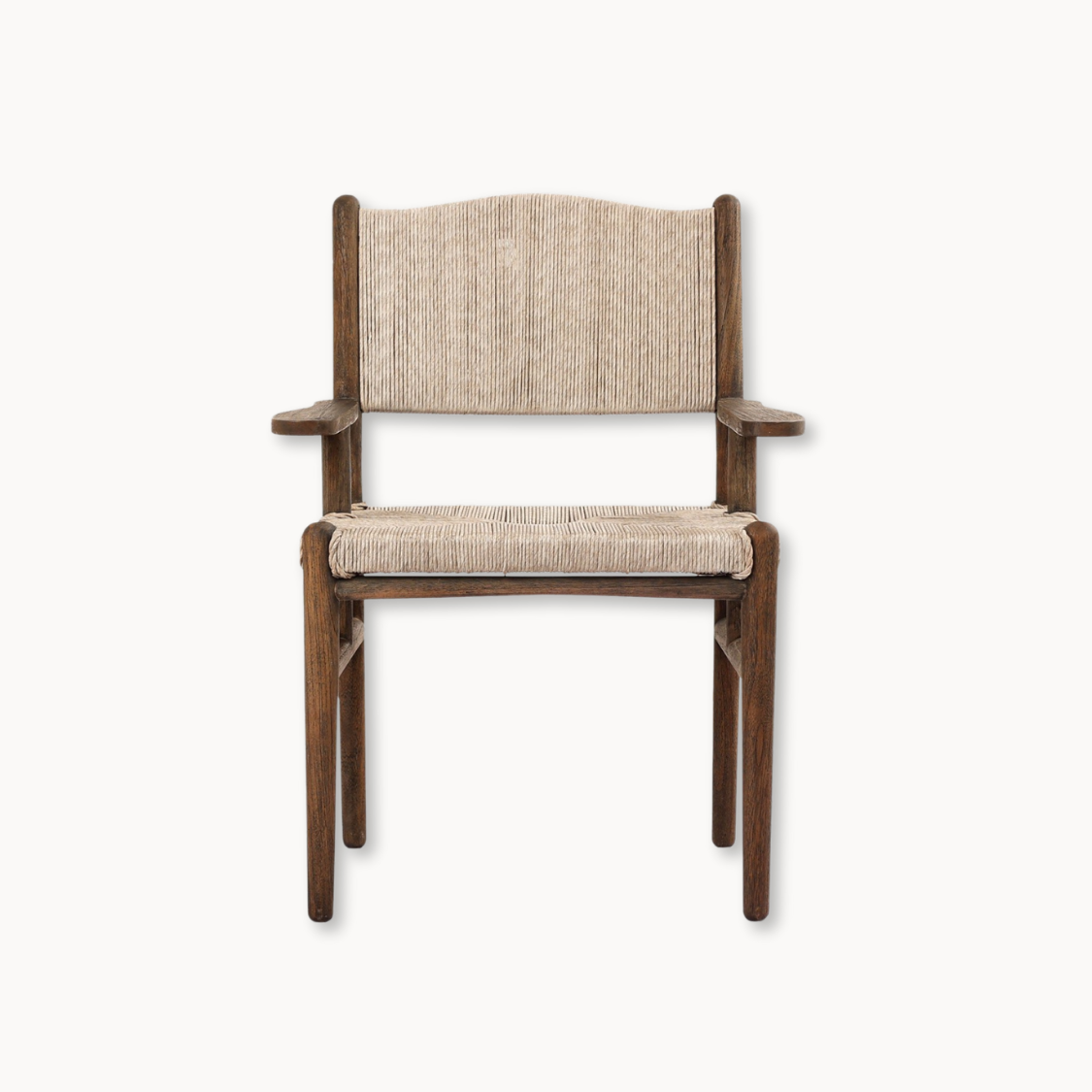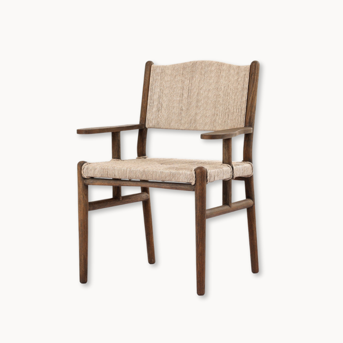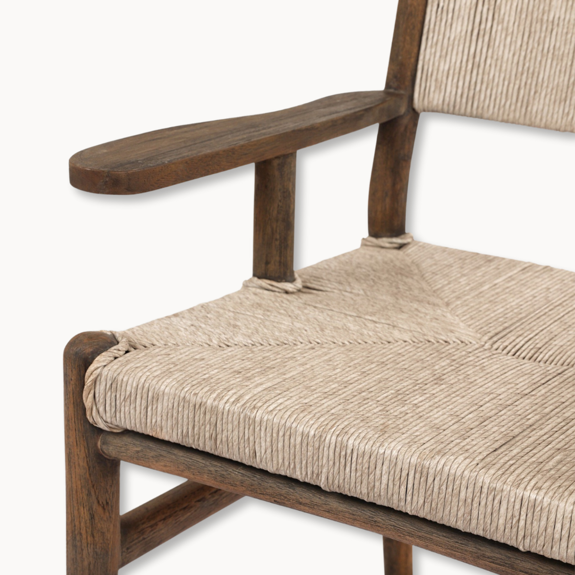 The Mackenna Outdoor Dining Armchair offers a refined yet relaxed approach to outdoor seating. Featuring a solid wood frame with a rich, warm finish and a handwoven rope seat and back, it combines comfort with lasting durability. The addition of sleek, integrated armrests enhances support, making it ideal for leisurely outdoor dining while seamlessly matching the armless Mackenna dining chairs for a cohesive look.