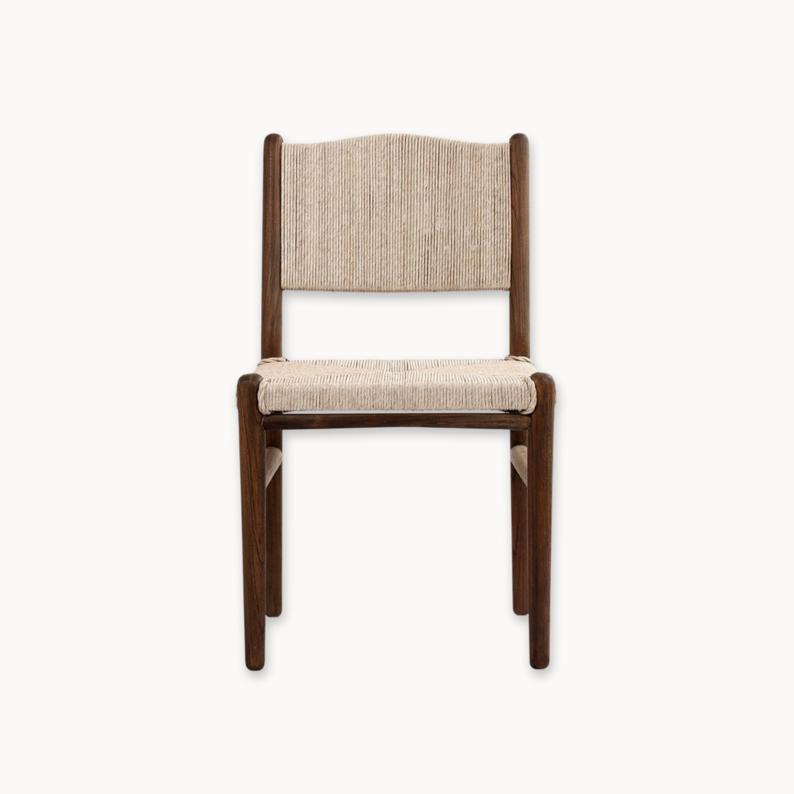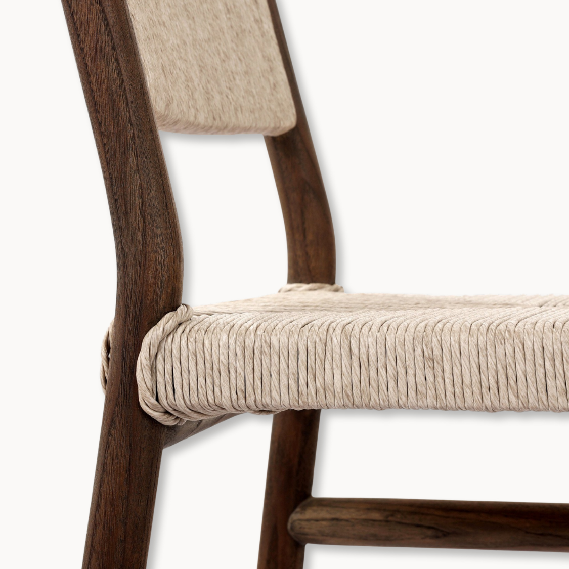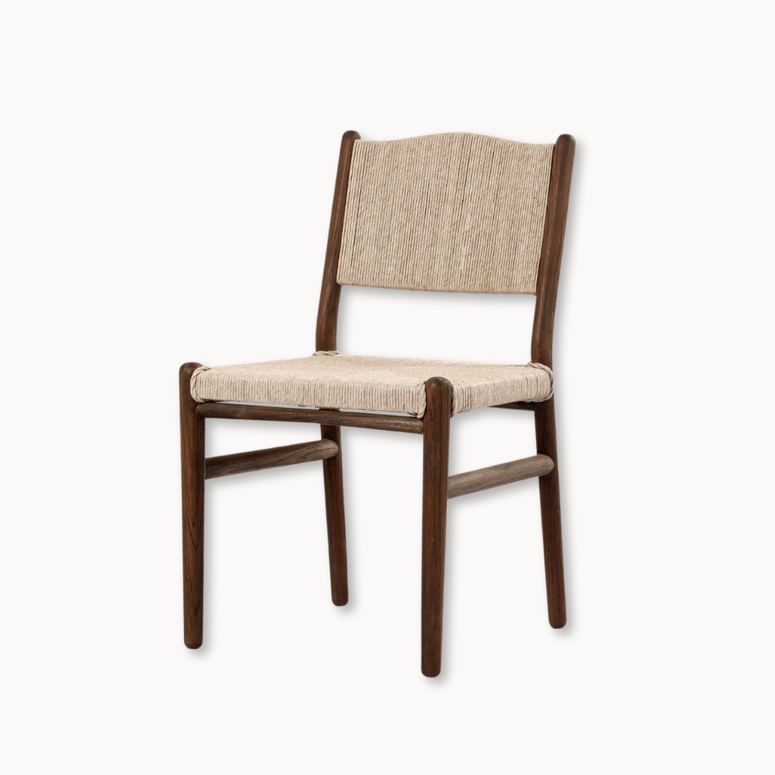 The Mackenna Outdoor Dining Chair brings understated elegance to alfresco dining. Crafted with a solid wood frame in a deep, rich finish, it features a woven rope seat and back that provide comfort and durability. Its timeless silhouette blends seamlessly with both modern and rustic outdoor settings, making it a versatile choice for any patio or garden dining area.