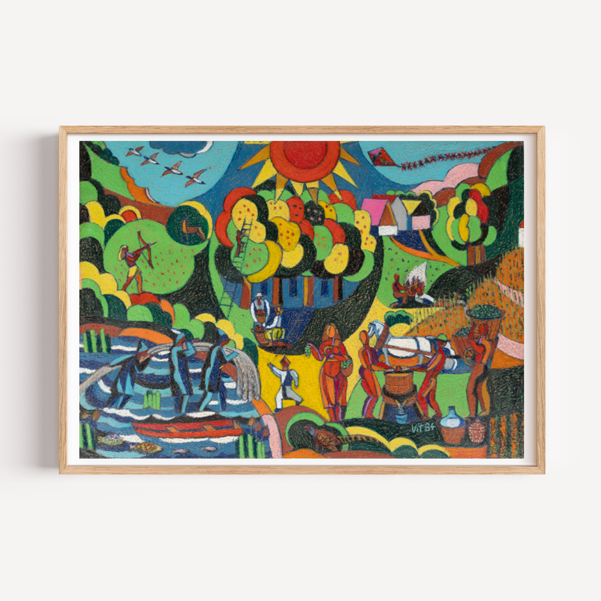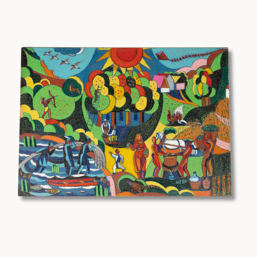 Rich with color and complexity, “Lives Intertwined” by Vitek is a vibrant tapestry of human connection set within nature’s embrace. Figures, foliage, and sunlit skies merge seamlessly in an intricate, layered composition that feels both alive and harmonious. With every glance, new stories and interactions emerge, revealing the depth of Vitek’s artistic vision. A bold and captivating work that speaks to the beauty of community and the rhythm of life itself.