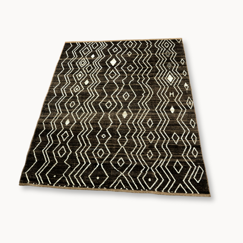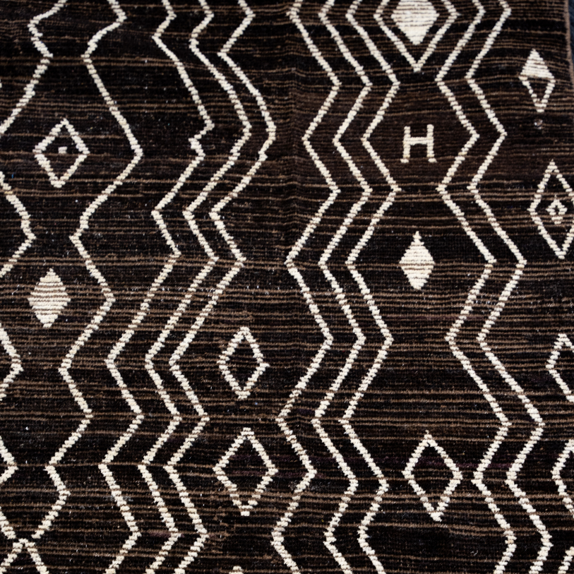 This striking Beni Ourain rug uses a rich onyx field as the backdrop for a bold ivory geometric pattern. Zigzags, diamonds, and scattered lozenges create a rhythmic, almost tribal cadence across the surface, with subtle irregularities that reveal the hand of the artisan. The dark ground gives the piece a dramatic presence, making it a perfect anchor for modern, minimalist, or eclectic interiors. Contemporary in execution but rooted in centuries-old Berber design tradition, it’s a statement piece with enduring style.