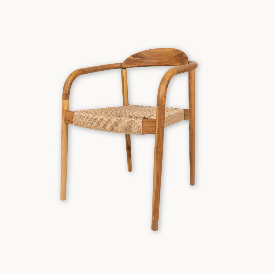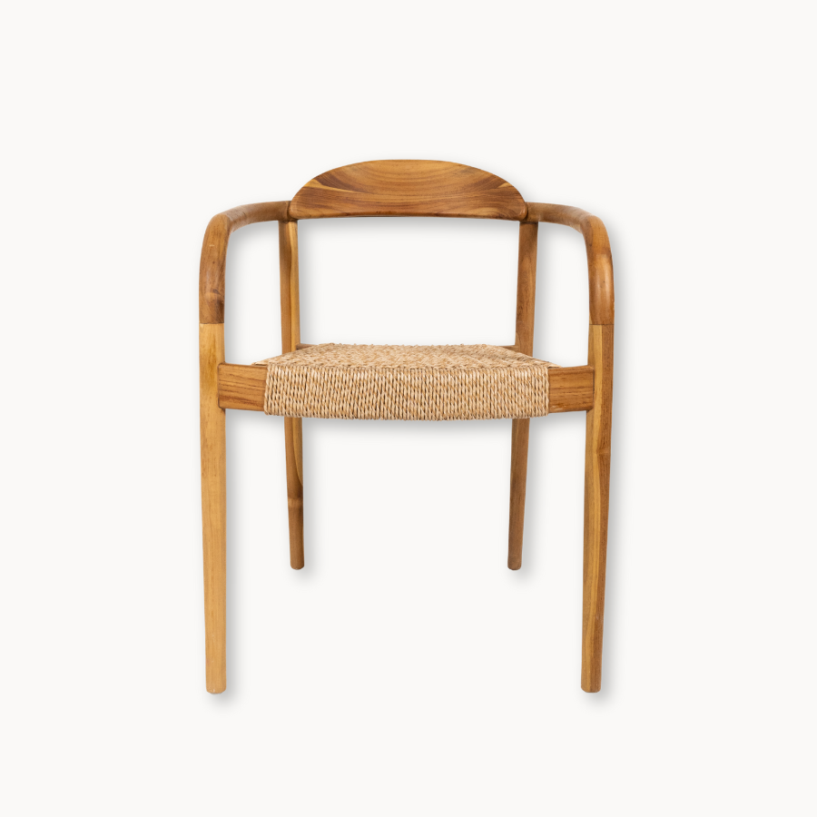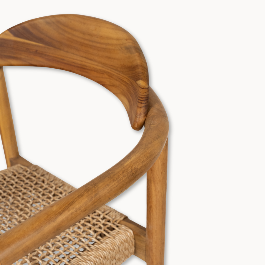 This Outdoor Woven Natural Teak Dining Armchair combines modern lines with timeless craftsmanship. Made from solid teak, it features a handwoven natural fiber seat that adds both comfort and texture. Its gently curved back and armrests offer a relaxed yet refined dining experience, perfect for outdoor gatherings. Built for durability and style, it naturally complements any patio or garden setting.