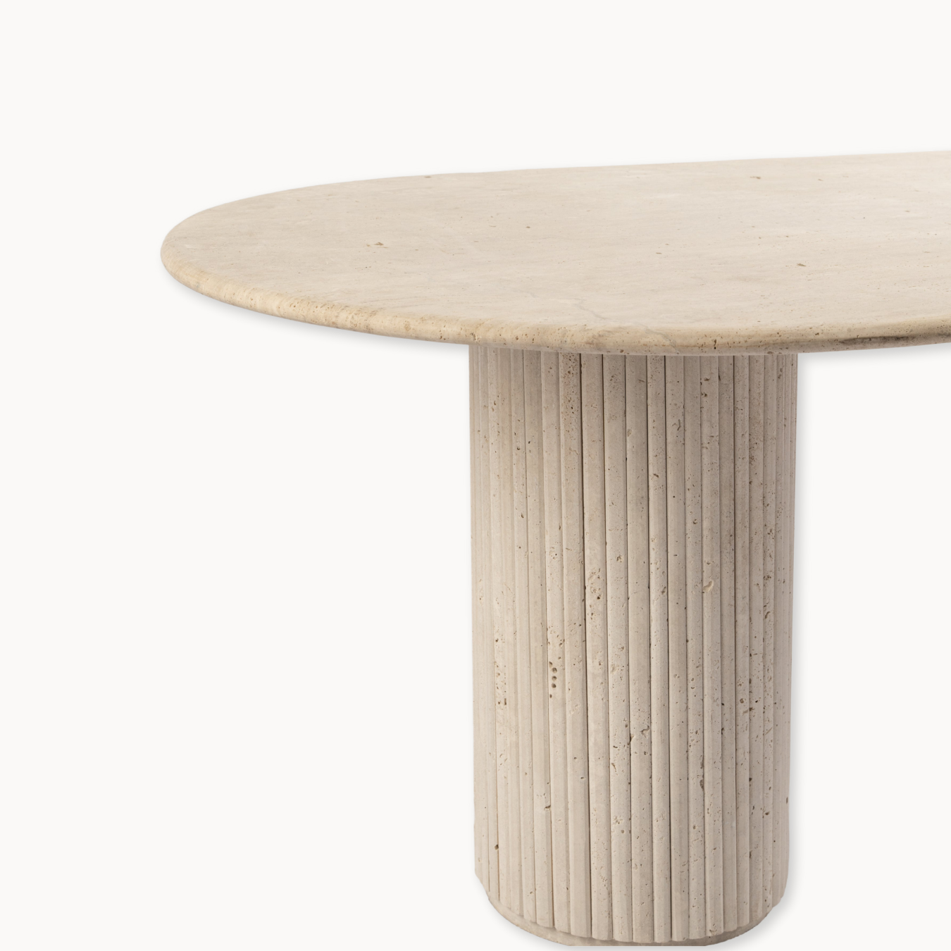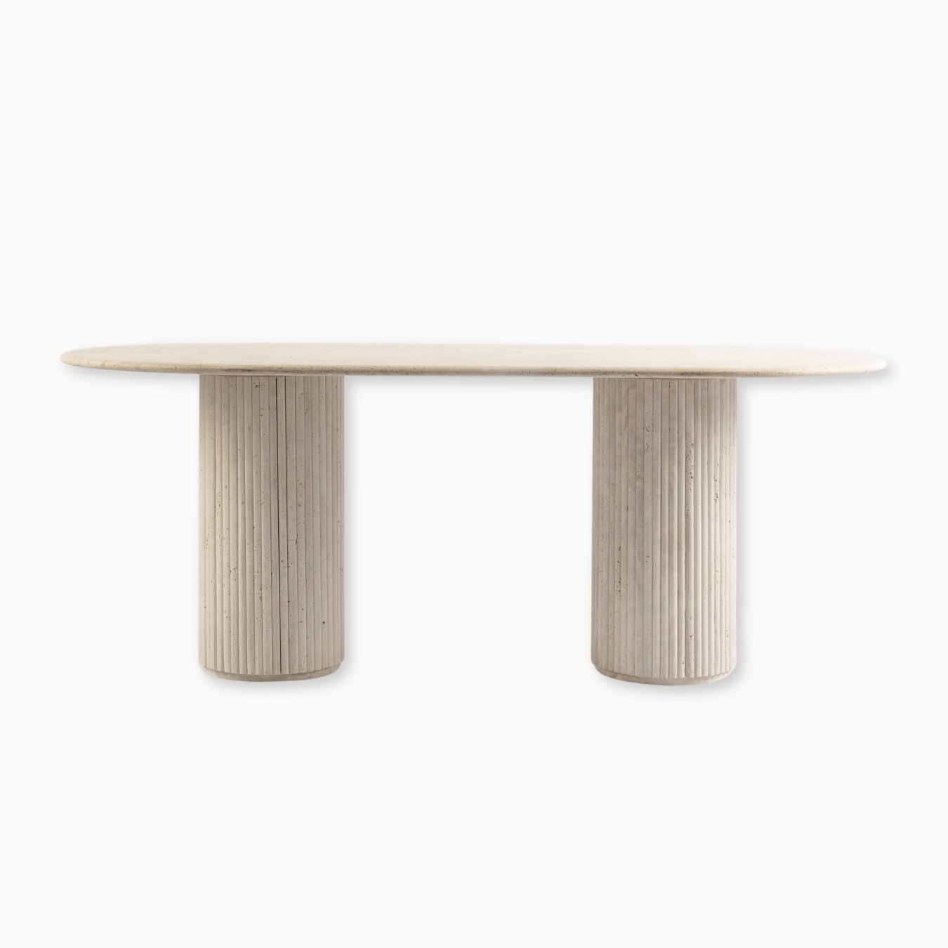 Make a bold statement with the timeless elegance of the Travertine Oval Dining Table. Its smooth, elongated top rests on dual cylindrical bases, creating a harmonious balance of shape and structure. The natural travertine stone showcases subtle variations in tone and texture, adding depth and sophistication to your dining area. Ideal for both casual gatherings and formal occasions, this table exudes understated luxury.