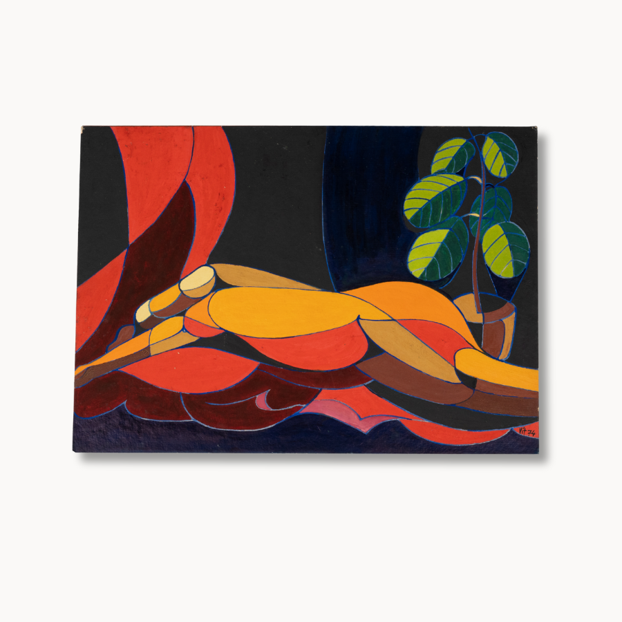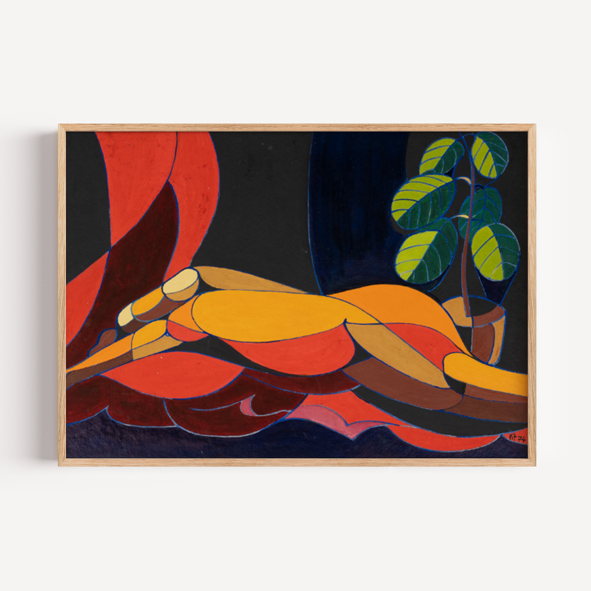Strikingly minimal yet powerful, “Primal Form” by Vitek explores the essence of human connection through bold, fluid shapes and a rich, warm palette. The reclining figure, rendered in golden tones against deep crimson and obsidian hues, evokes both raw emotion and timeless elegance. Subtle botanical elements soften the composition, creating a balance between strength and serenity. A commanding piece for collectors drawn to abstract works with visceral impact and refined modernity