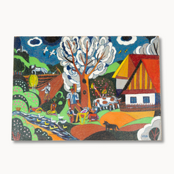 Radiating rustic charm, “Ranchin” by Vitek brings pastoral life to vivid, contemporary form. Rolling fields, playful livestock, and bright cottages nestle beneath a blossoming tree, all rendered in Vitek’s signature geometric brushwork and lively color palette. The composition balances movement and stillness, evoking the quiet beauty of country living with a modern, collectible edge. A striking piece that infuses interiors with warmth and artistic sophistication.