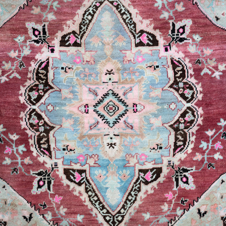 A captivating fusion of earthy reds, dusty blues, and hints of blush pink, the Rosewater Valley Rug carries an air of refined warmth. Its intricate center motif is framed by soft, weathered tones that give it an heirloom appeal. Subtle floral and vine accents weave throughout, adding depth and delicate charm to the composition. Perfect for grounding a room with both color and character, this piece offers timeless elegance with a touch of vibrancy.