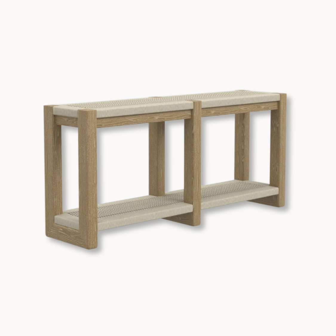 Part of our Sedona Collection: outdoor-ready designs crafted from teak wood and wicker in soft, neutral tones - the Sedona Console Table is a study in refined simplicity, blending natural textures with modern lines. Crafted with a light wood frame and woven shelving, it offers both durability and understated elegance. Its open, airy design makes it perfect for entryways, living rooms, or behind a sofa, providing versatile display and storage space. A timeless piece that complements contemporary, coastal, and organic-inspired interiors alike.