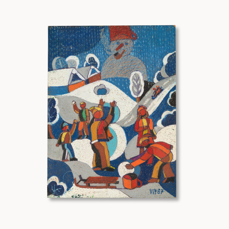 Playful and full of seasonal charm, “Snowman” by Vitek captures the joy of wintertime festivities. Children in vibrant coats animate the snowy hillside, building a towering snowman beneath a crisp blue sky. Vitek’s signature geometric forms and lively palette bring a modern twist to this nostalgic scene, transforming a familiar winter pastime into a striking, collectible work of art.