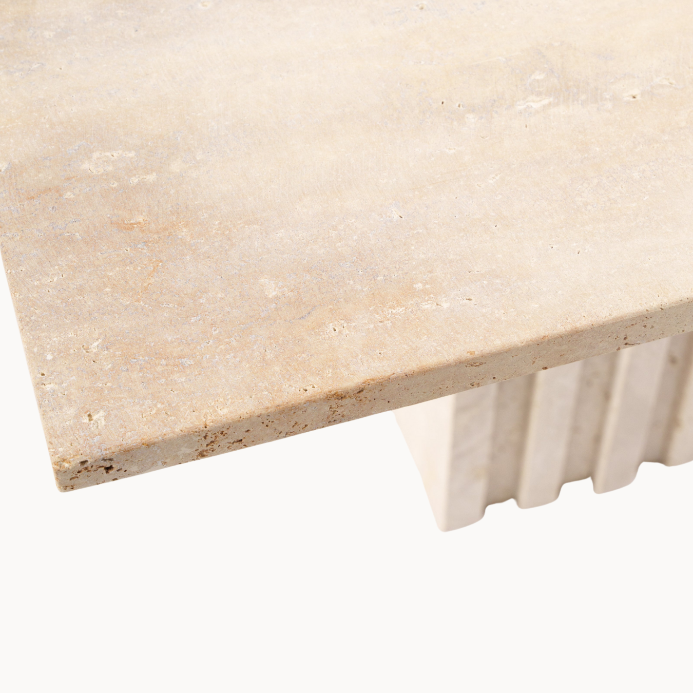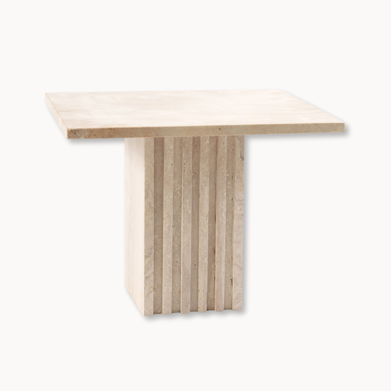 A striking blend of natural elegance and sculptural form, this travertine side table makes a statement with its refined materials and architectural detailing. The fluted pedestal base adds depth and texture, beautifully contrasting the smooth, honed stone top. Crafted from solid travertine, its warm, earthy tones and unique veining make each piece one of a kind. Whether styled beside a lounge chair or as a sculptural accent in a curated space, this table brings timeless sophistication to any interior. A true balance of artistry and function, perfect for those who appreciate organic beauty in their furnishings.