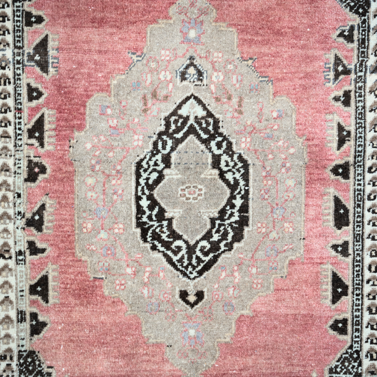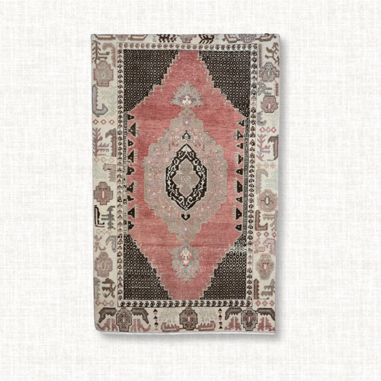 This hand-knotted vintage rug makes a striking impression with its bold coral central medallion framed by a richly patterned dark ground. A soft slate-grey medallion within the coral adds layered depth, while a detailed border in neutral tones of ivory, taupe, and slate brings visual balance and structure. The contrasting palette—warm yet grounded—draws the eye into the center, while unique tribal glyphs and geometric lines in the border nod to artisan heritage. Subtle wear gives it a natural, lived-in softness, making it a refined focal point for living rooms, entryways, or layered arrangements.