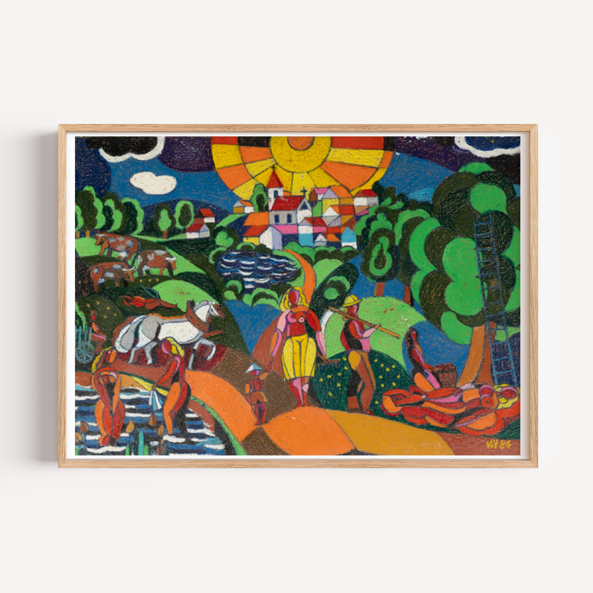 Radiant and dreamlike, “Sun Meets the Moon” by Vitek captures the poetic harmony of day and night within a lush, whimsical landscape. Golden sunlight merges with twilight tones as figures and animals wander through vibrant fields and tranquil waters. The composition is alive with movement and symbolism, reflecting the eternal dance of nature’s cycles. A luminous, gallery-worthy piece that brings warmth and wonder to any space.