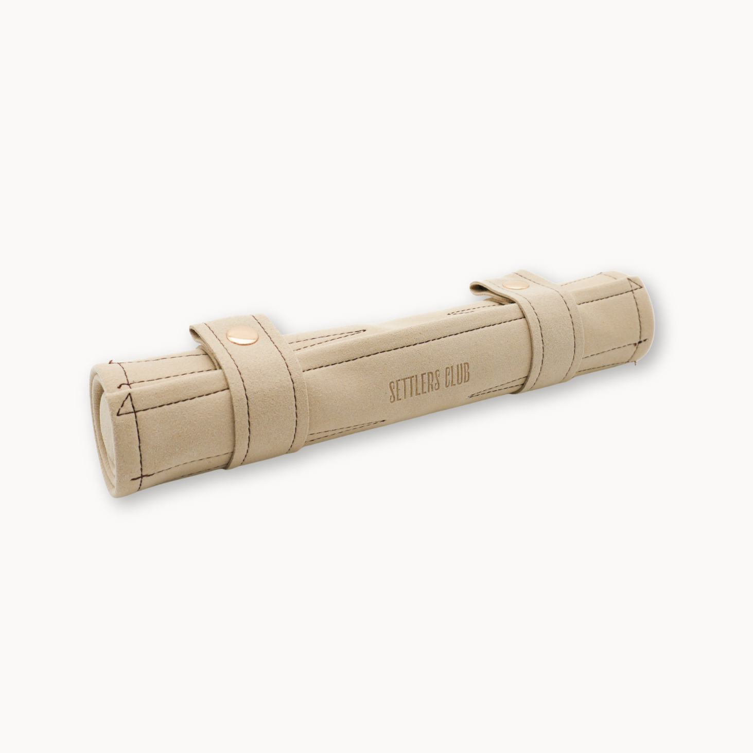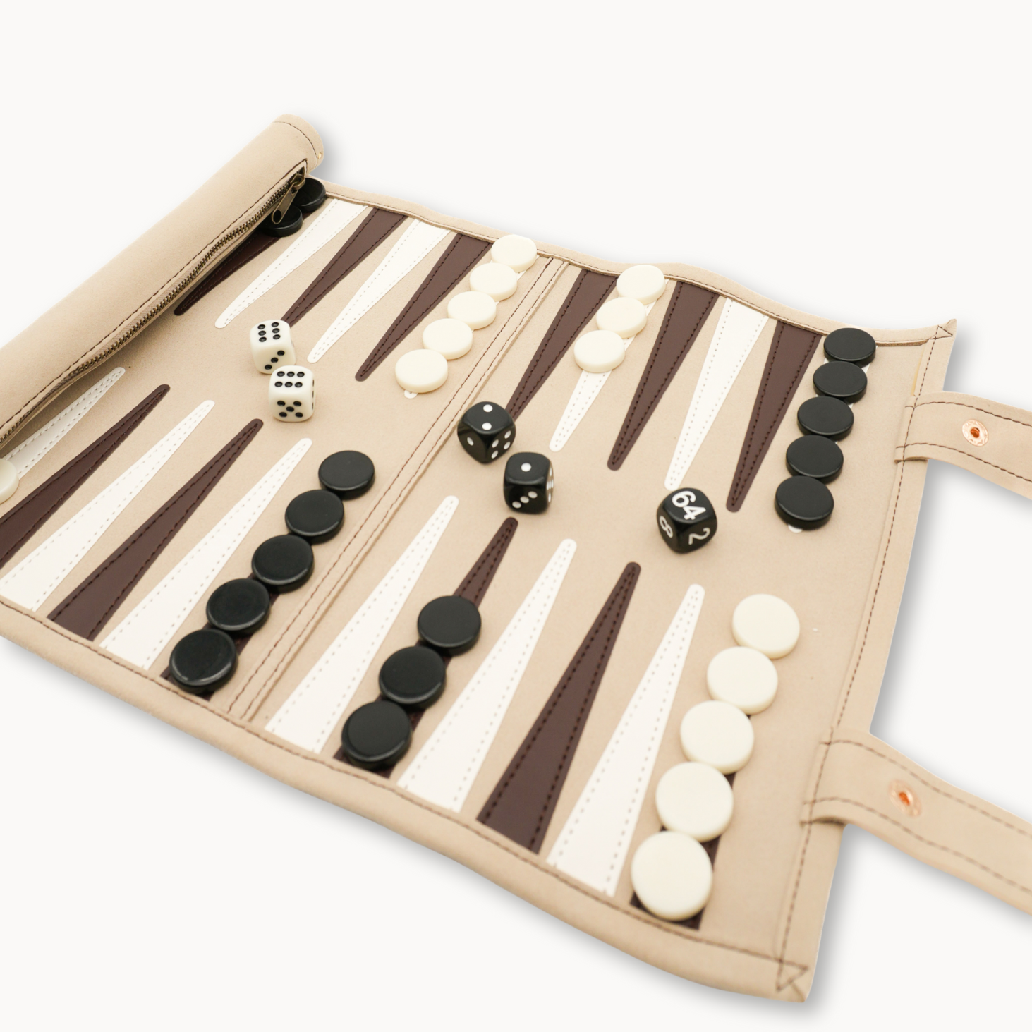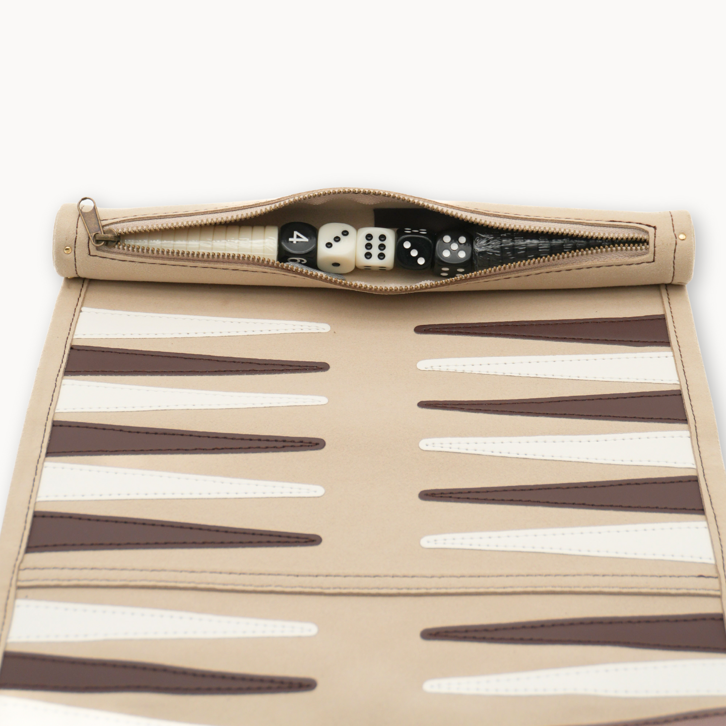 Elevate your leisure moments with this elegantly crafted Alcantara travel backgammon set, where refined design meets timeless play. The rich tones of cream, espresso, and ivory create a striking visual harmony that’s as captivating as the game itself. Thoughtfully designed to roll up with ease, it slips effortlessly into your weekender or carry-on for spontaneous sophistication on the go. Perfect for intimate gatherings or laid-back afternoons, each match invites conversation, connection, and a touch of old-world charm.