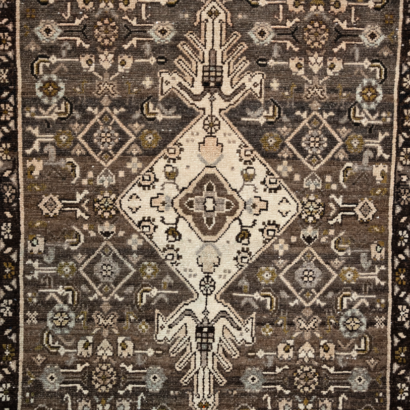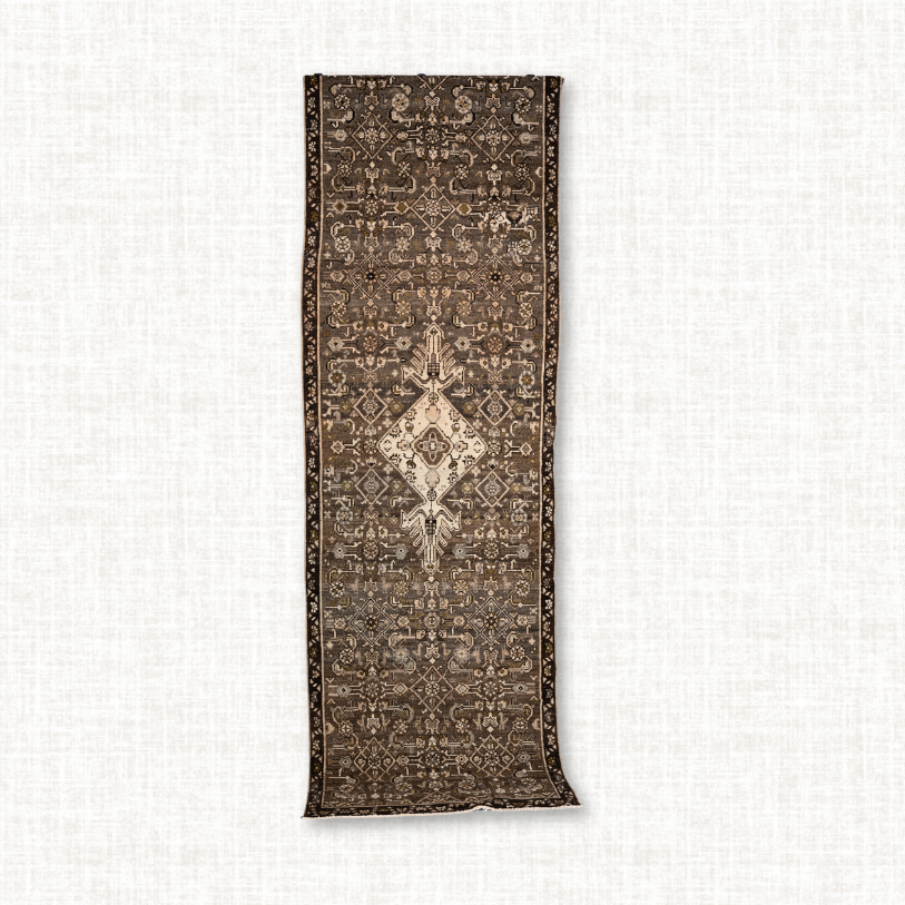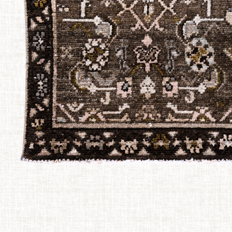 Hand-knotted in Anatolia, this vintage runner features a bold ivory central medallion set against a rich mocha-brown field. The intricate geometric and floral motifs, accented with muted gold, grey, and soft cream, showcase the region’s traditional weaving artistry. Likely dating to the mid-20th century, it is woven from durable hand-spun wool with a medium-low pile suited for hallways, kitchens, or entryways. The elongated format and symmetrical design draw the eye along its length, adding both function and timeless character to narrow spaces. Its earthy palette pairs beautifully with both rustic and modern interiors.