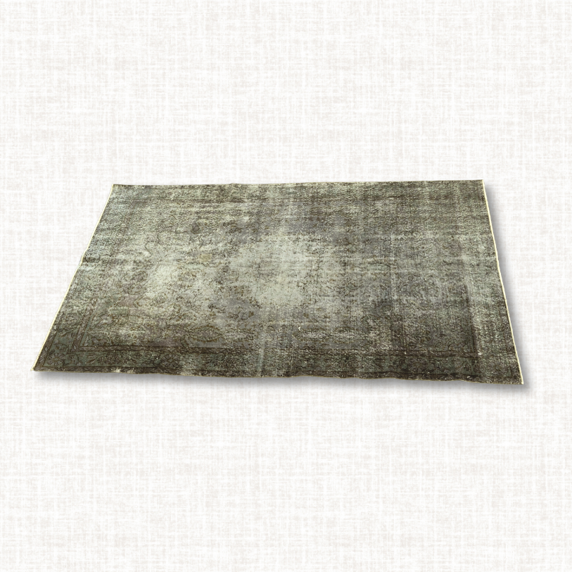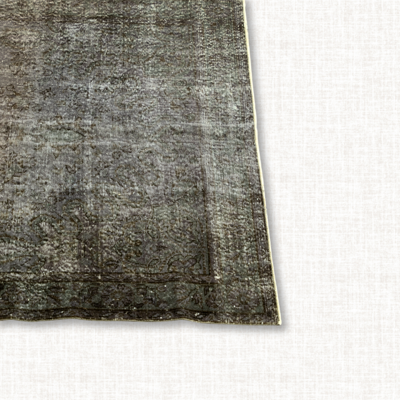 Hand-knotted in Türkiye, this vintage Oushak rug presents a richly weathered palette of deep moss green and charcoal, softened by decades of natural fading. Beneath its worn surface lies a traditional medallion-and-corner design, now subtly ghosted into the background for an understated, moody elegance. Likely dating to the mid-20th century, it’s woven from hand-spun wool with a low, even pile that suits high-traffic areas. The muted earth tones and aged patina make it a versatile statement piece for spaces seeking warmth, texture, and a sense of history.