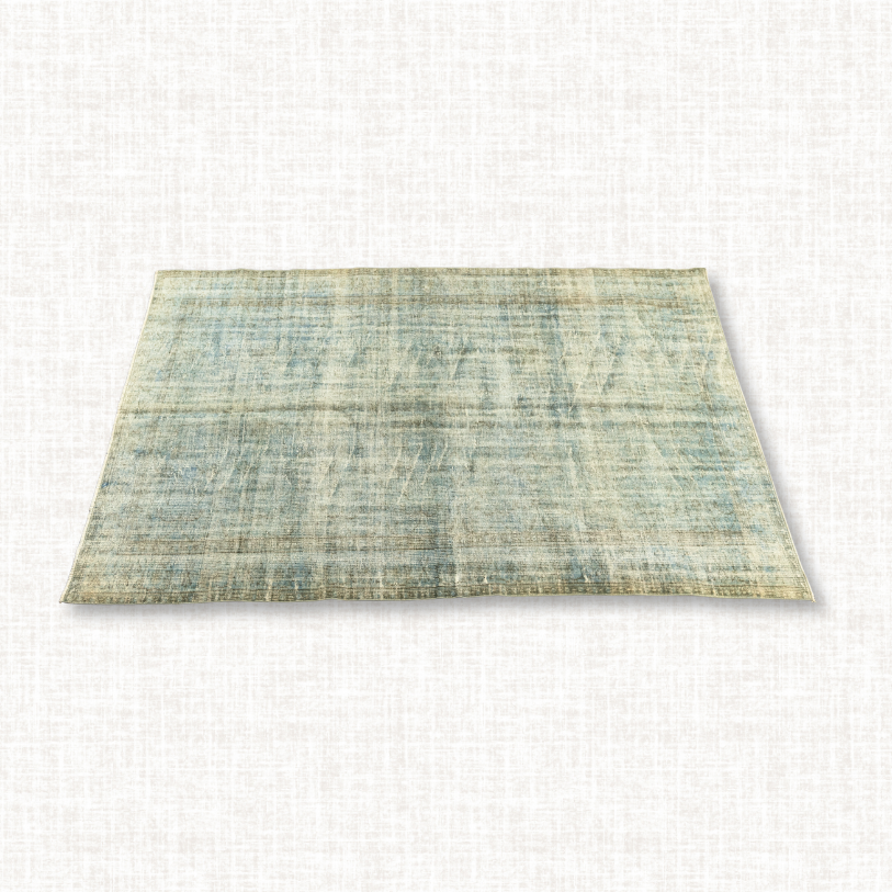 Hand-knotted in Türkiye, this vintage Oushak rug features a subtly striated field in muted aqua, sand, and soft taupe. The absence of a central medallion or border shifts the focus to its tonal variations, which are created by hand-spun, naturally dyed wool. Likely dating to the mid-to-late 20th century, the rug’s minimal pattern and worn patina give it a relaxed elegance perfect for coastal, contemporary, or bohemian interiors. Its low pile and airy palette make it both practical and versatile, offering an understated backdrop that complements a range of furnishings and color schemes.