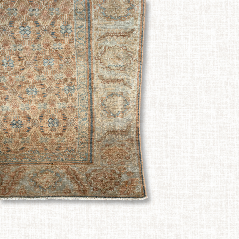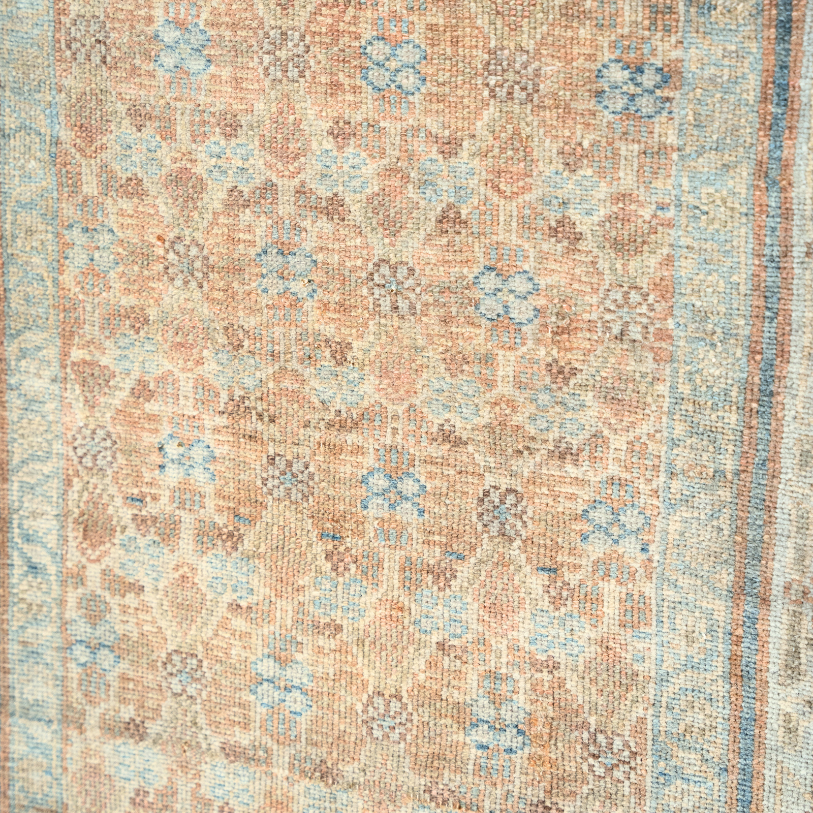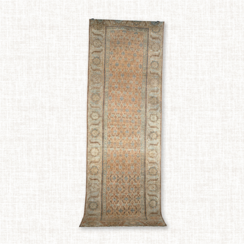 This vintage Oushak runner features an allover botanical pattern in warm rust tones accented with soft sky blue and muted beige. The wide border is adorned with large-scale medallions and stylized floral motifs, adding rhythm and balance to the composition. Likely dating to the mid-20th century, it is woven from hand-spun wool with a supple, low pile that has softened beautifully over time. The harmonious palette and elongated proportions make it ideal for hallways, kitchens, or entryways, adding both warmth and artisanal charm to the space.
