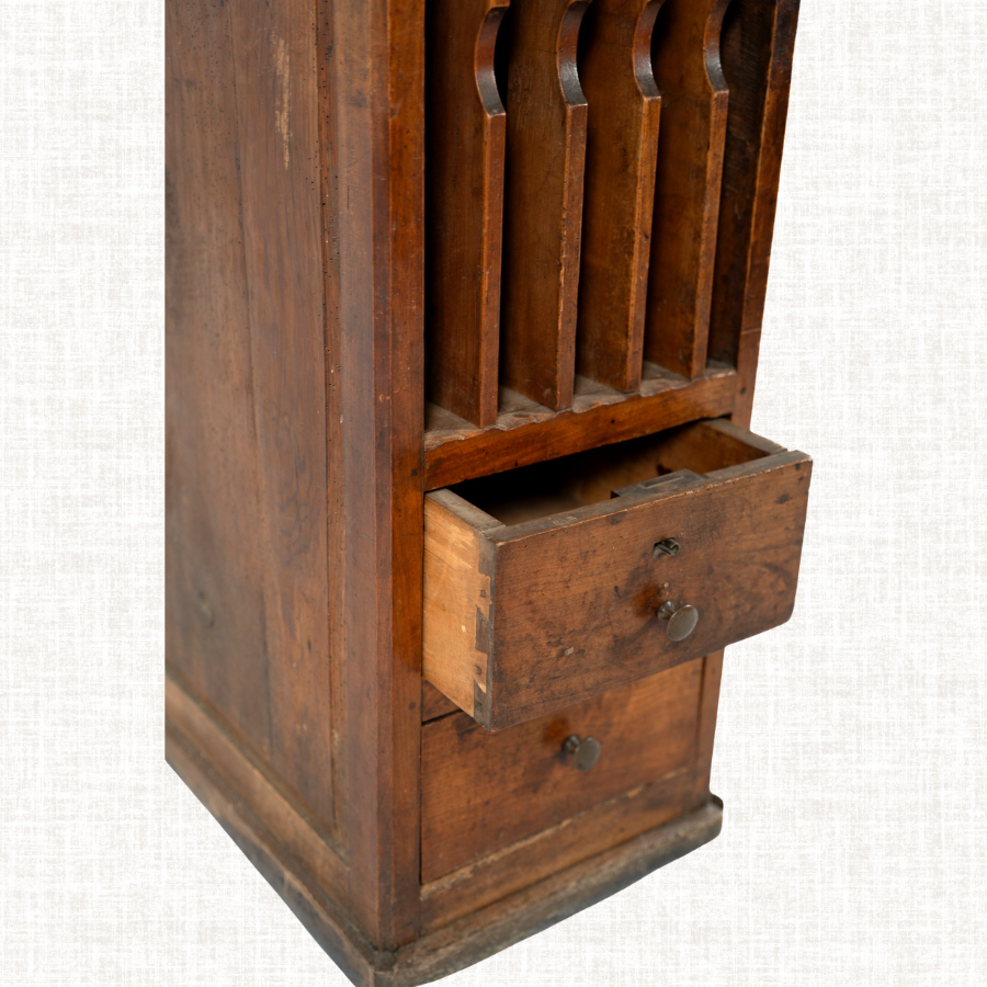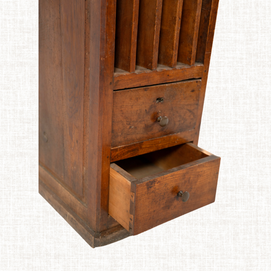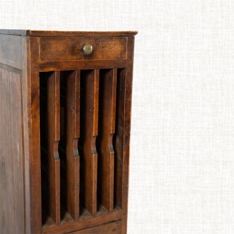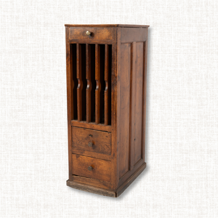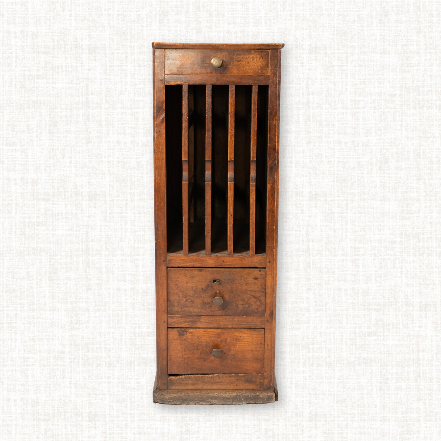 Experience the charm and nostalgia of the past with our 20th Century Oak Office Cabinet. Crafted from solid oak with original brass hardware, this narrow cabinet features three drawers and a slatted cubby—ideal for organizing papers, files, or cherished objects. Its warm patina and classic proportions bring understated sophistication to any workspace or study. Upgrade your office with a touch of history and elevate your productivity in style.