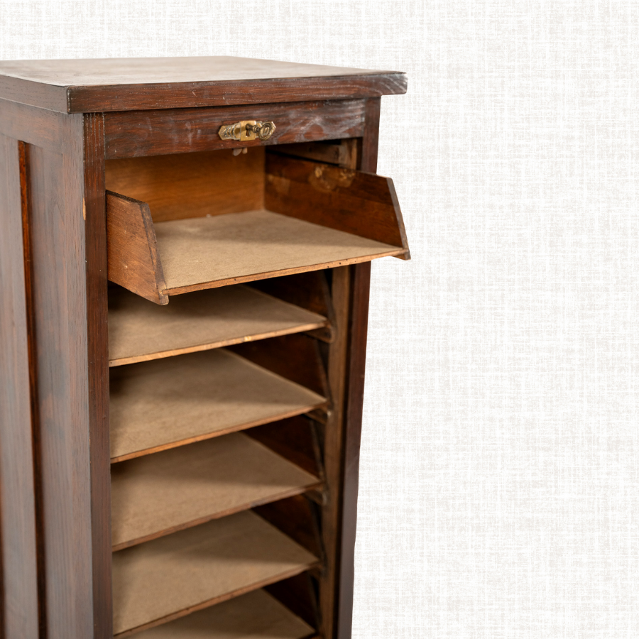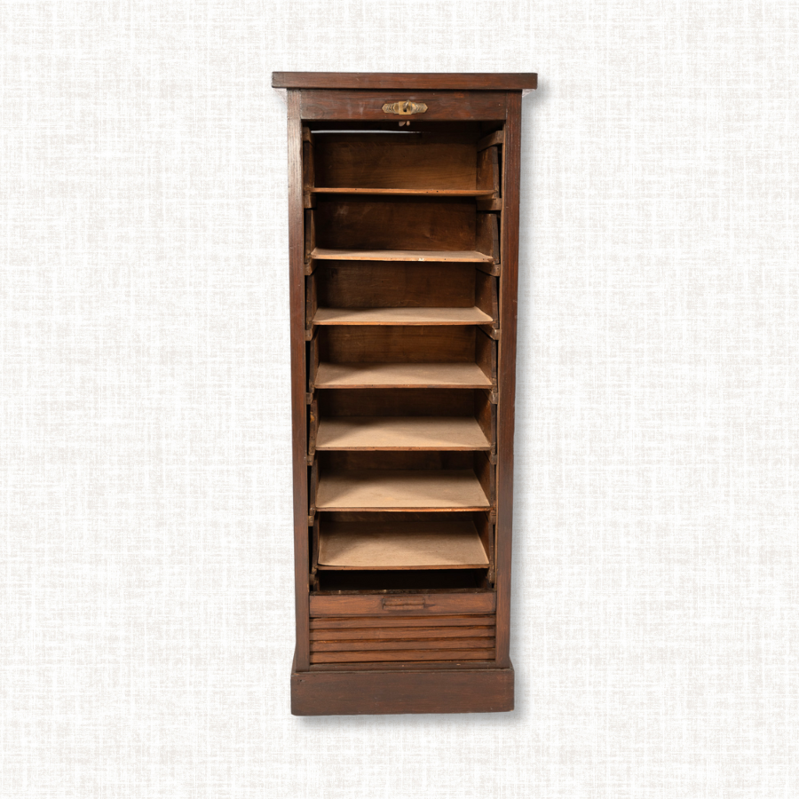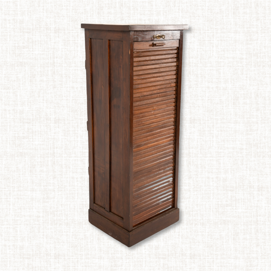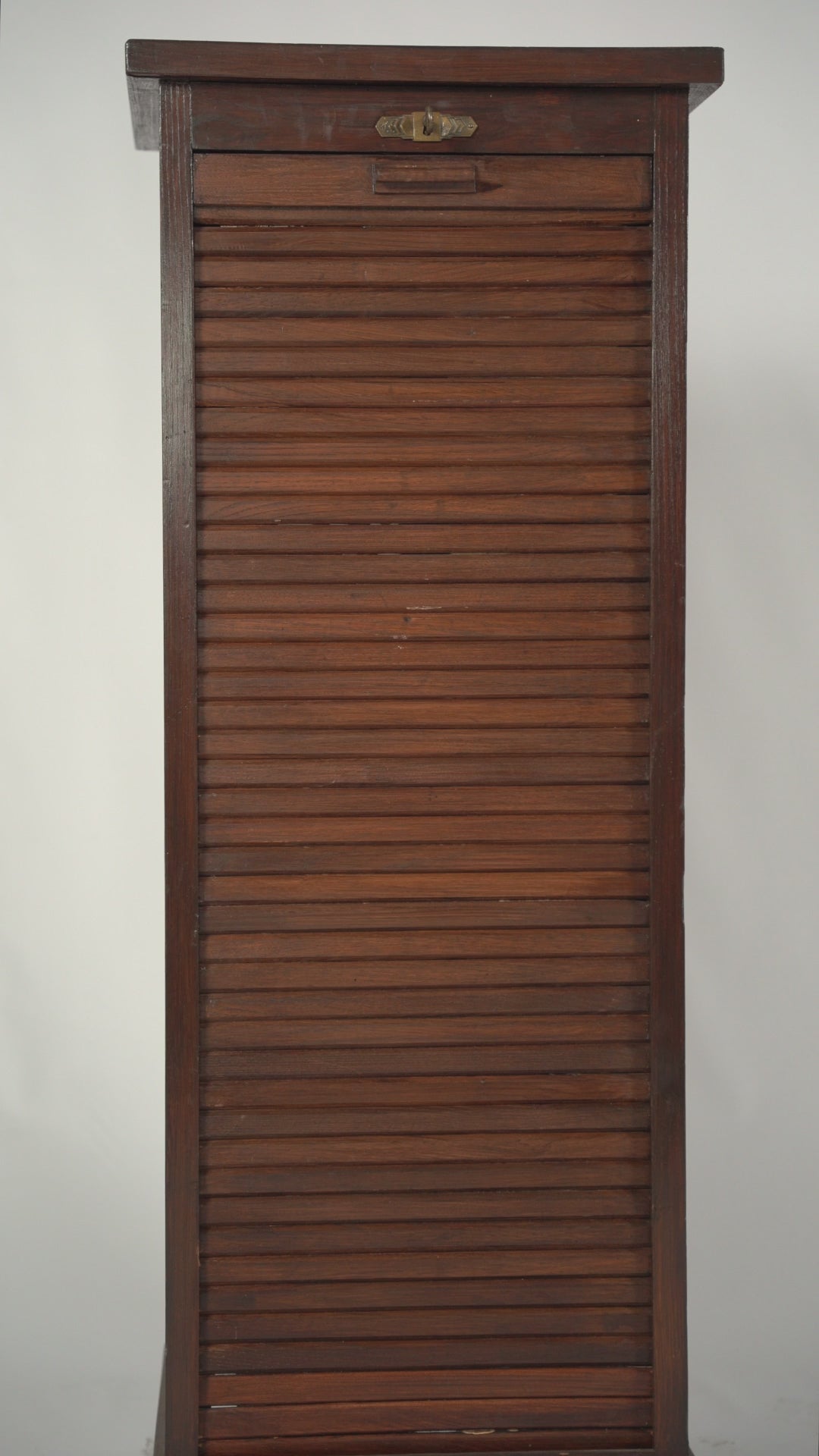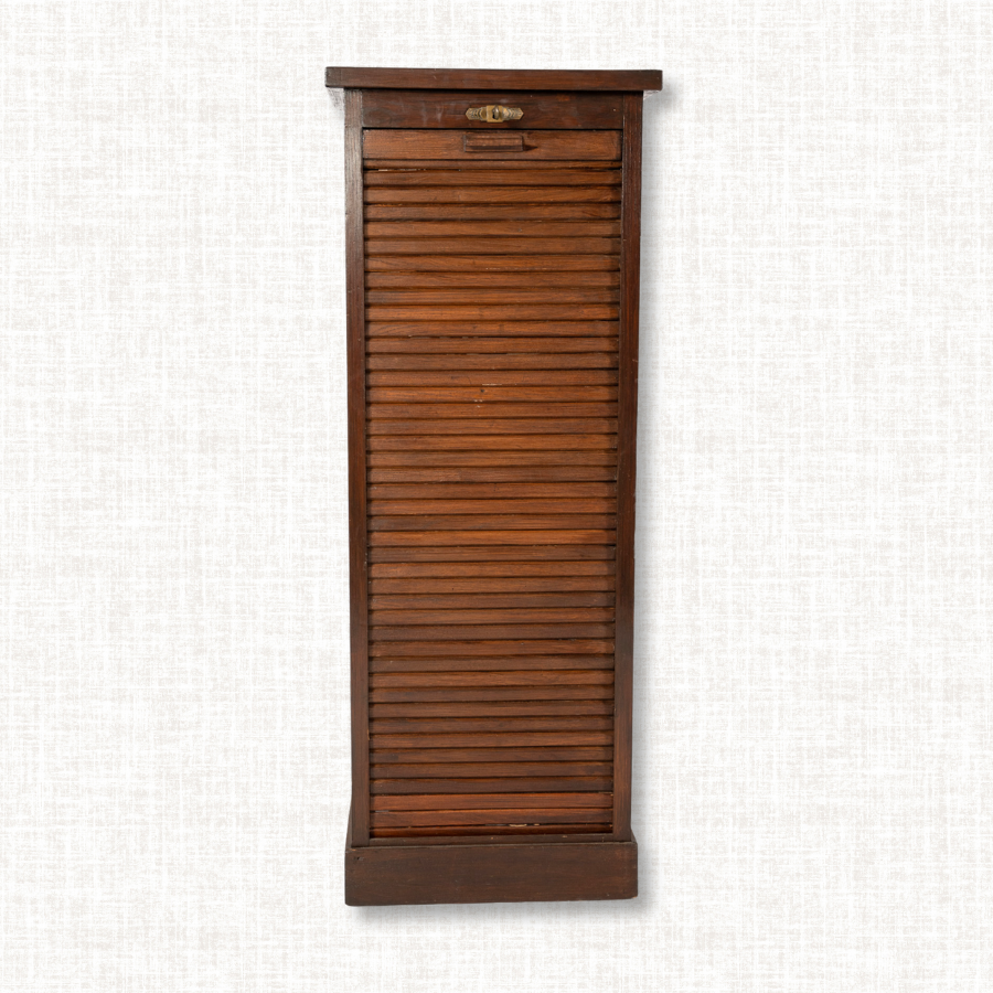 Elevate your workspace with the 20th Century Oak Filing Cabinet. Crafted from rich oak with a classic tambour roll-top design, this piece blends vintage appeal with everyday utility. The compact footprint and concealed storage make it ideal for organizing documents without sacrificing style. Experience the timeless charm and functionality of this elegant piece, perfect for both home offices and curated interiors.