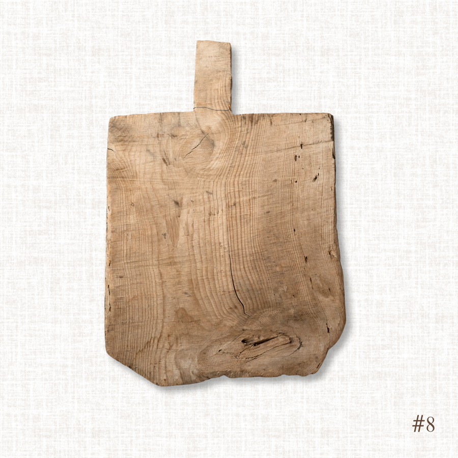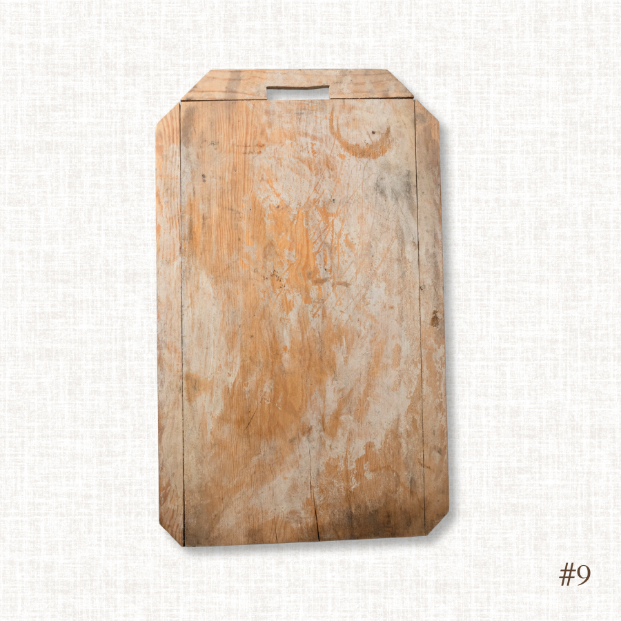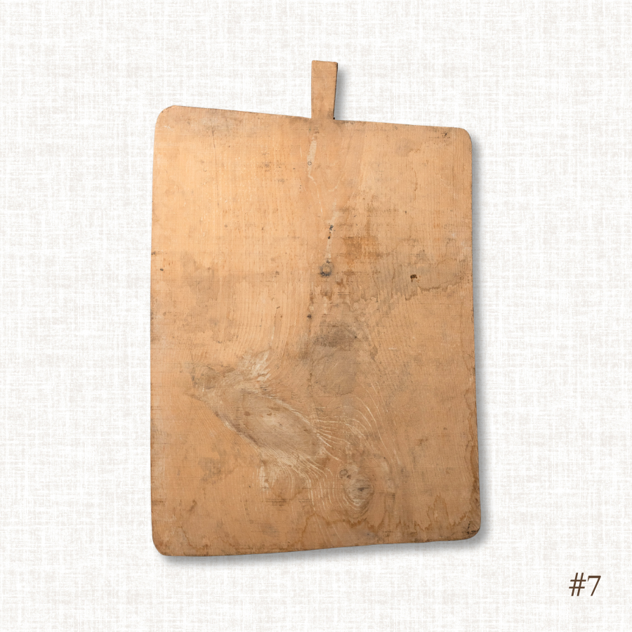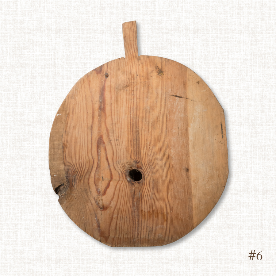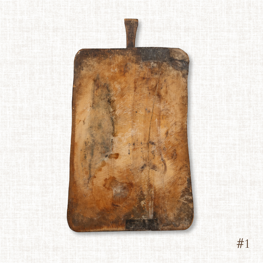 Each of these vintage cutting boards has been hand-carved from solid wood and carries a rich history of use, evident in the worn surfaces, unique shapes, and time-softened patina. No two are alike—some feature repairs or natural splits that highlight their age and authenticity, while others bear distinctive markings that make them one-of-a-kind. Whether styled as a serving tray, a kitchen accent, or hung on the wall as rustic décor, these boards bring timeless farmhouse character into any space.