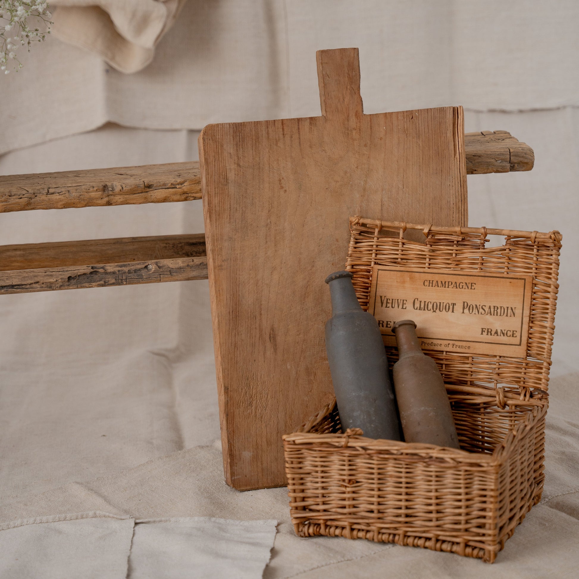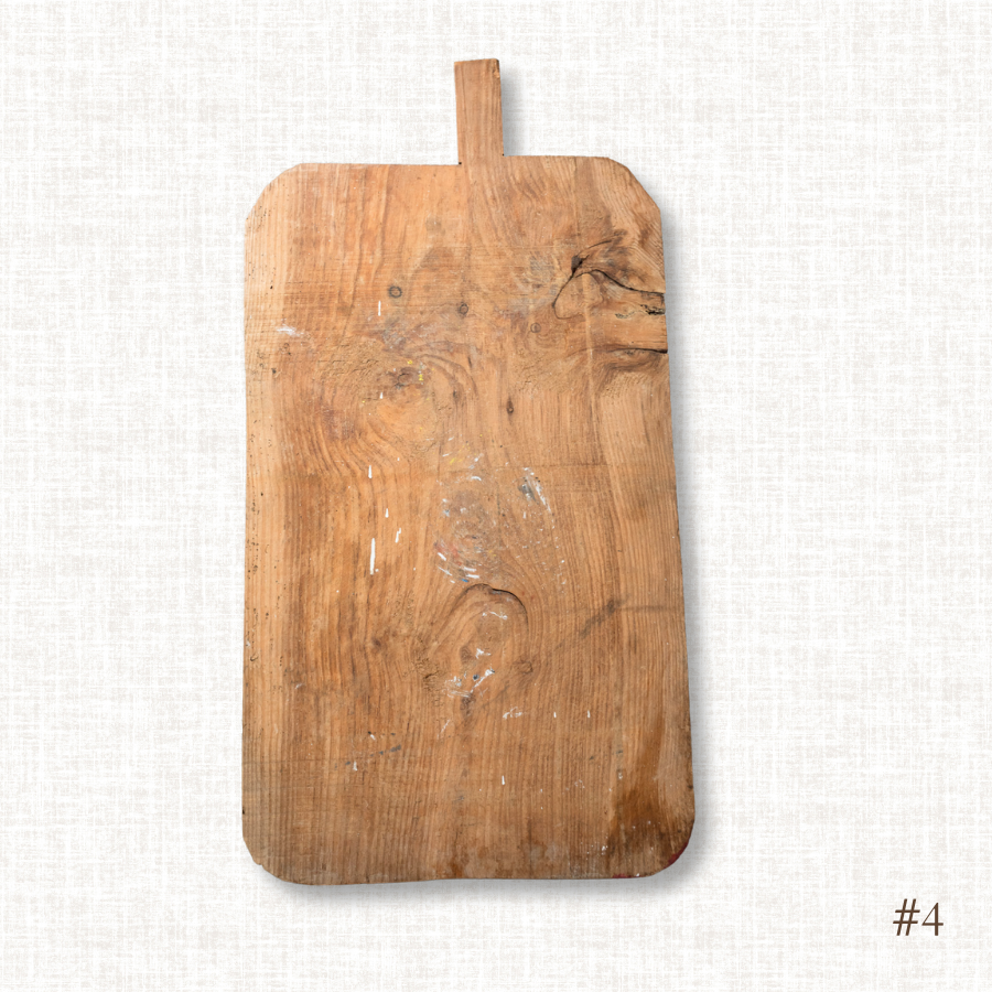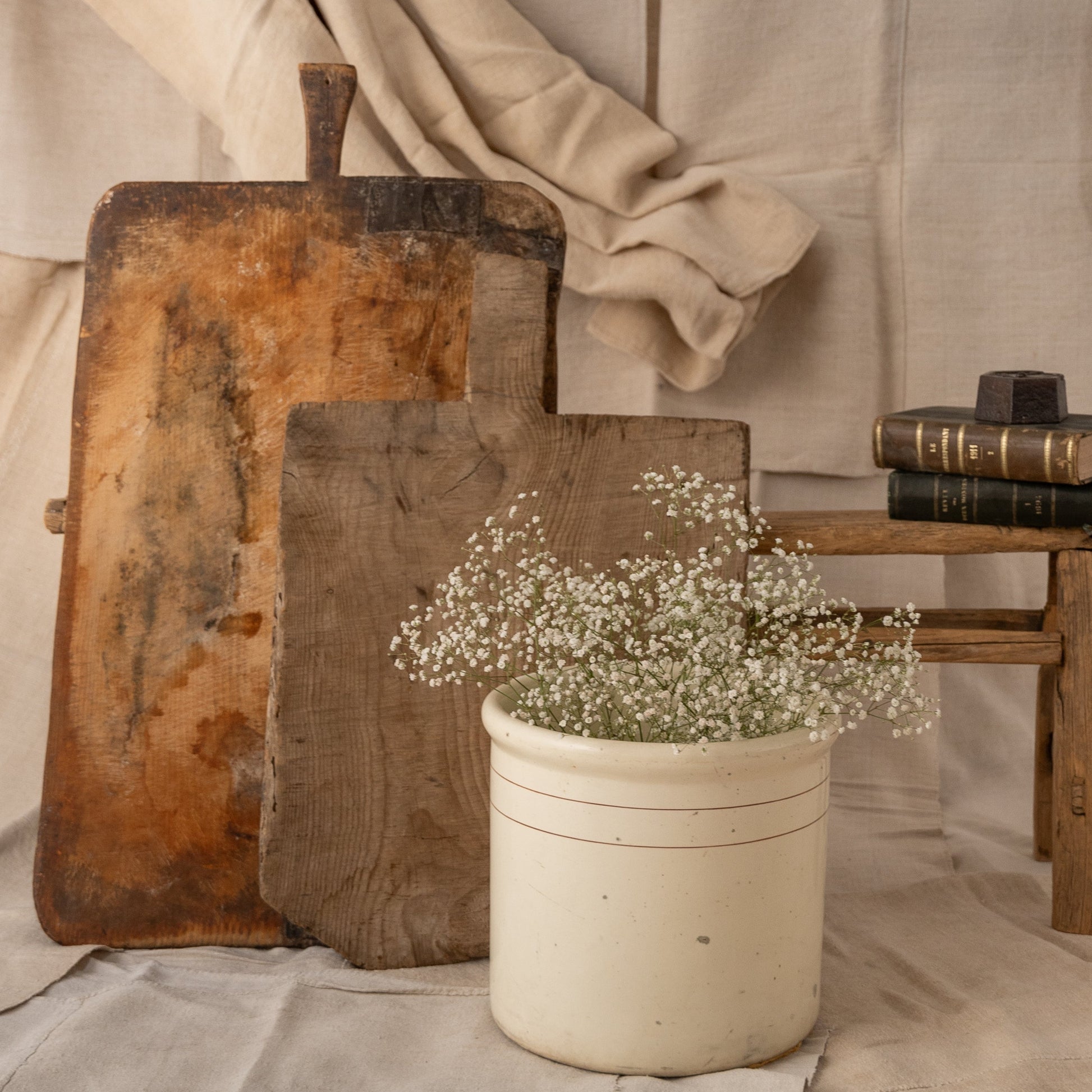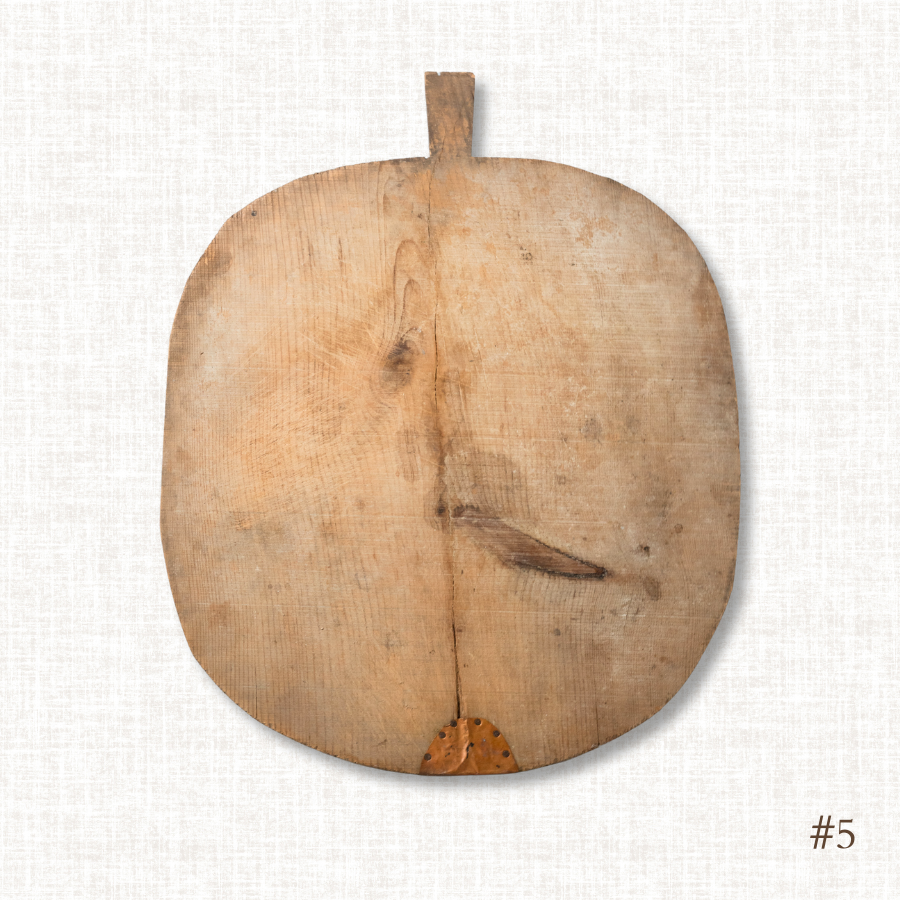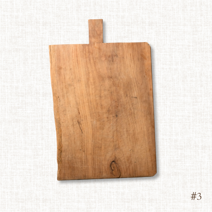 Each of these vintage cutting boards has been hand-carved from solid wood and carries a rich history of use, evident in the worn surfaces, unique shapes, and time-softened patina. No two are alike—some feature repairs or natural splits that highlight their age and authenticity, while others bear distinctive markings that make them one-of-a-kind. Whether styled as a serving tray, a kitchen accent, or hung on the wall as rustic décor, these boards bring timeless farmhouse character into any space.