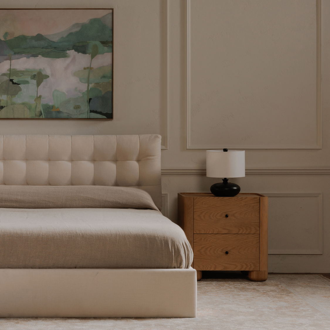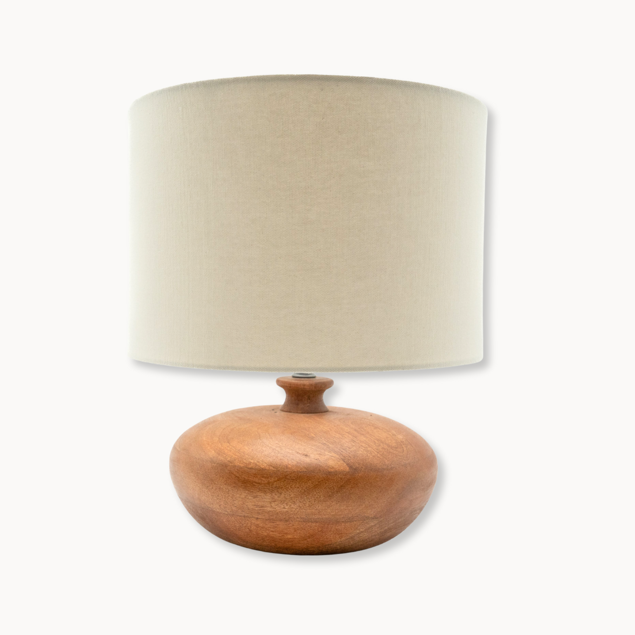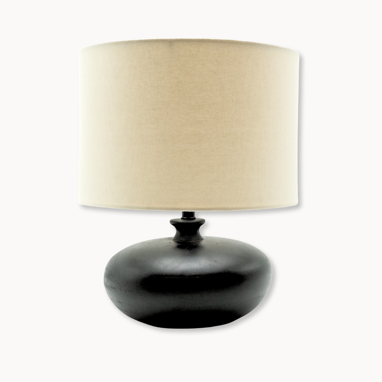 Grounded in old-world craftsmanship, this table lamp brings a sense of timeless elegance to any space. Its rounded base, turned from black-finished mango wood, feels both sculptural and refined—an organic form that nods to vintage heirlooms. The cotton shade adds a soft contrast with its natural texture, diffusing light with a warm, dimensional glow. Sustainably crafted from mango wood harvested after the trees have stopped bearing fruit, this piece blends thoughtful design with environmental responsibility. Some assembly required; bulb not included.