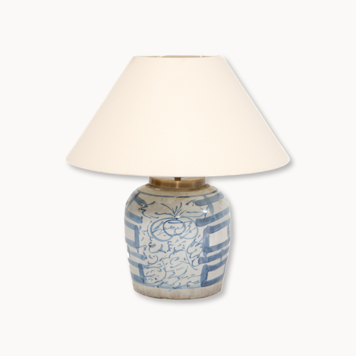 The Wedding Pot Table Lamp transforms a vintage Chinese clay wedding pot into a stunning modern lighting piece. Its white-and-navy glazed base features two "Xi" characters, a symbol of double happiness and marriage. Paired with a taupe empire shade, this lamp provides warm, ambient lighting and is equipped with modern electrical components supporting a 60W bulb. Elegant and versatile, it seamlessly complements classic, modern, or rustic decor, making it a perfect addition to both homes and event spaces.