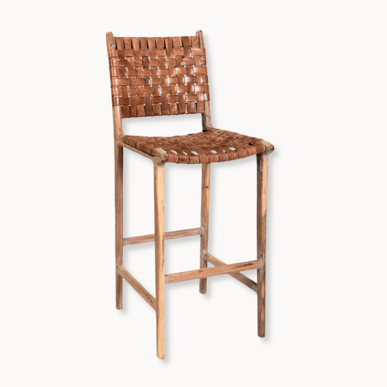 The Wooden Bar Stool with Woven Leather combines rustic elegance with contemporary style, making it a standout addition to any kitchen or bar area. Its sturdy wooden frame highlights the natural beauty of the wood, while the handwoven leather seat and backrest provide comfort, durability, and a unique texture. The warm tones of the leather contrast beautifully with the wood, creating a timeless aesthetic that complements a variety of decor styles. Designed for both functionality and visual appeal, this bar stool is perfect for casual gatherings or elevated dining experiences. Its handcrafted quality ensures it will remain a stylish and durable seating option for years to come.